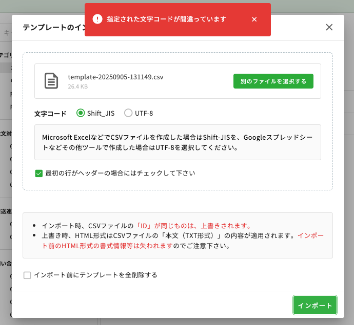 ・テンプレートとフレーズはそれぞれCSVファイルの列数が異なります。そのため、テンプレートに対してフレーズのCSVファイルをインポートした場合はエラーとなります。インポートしているファイルが正しいCSVファイルを参照しているかご確認ください。