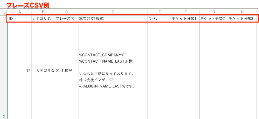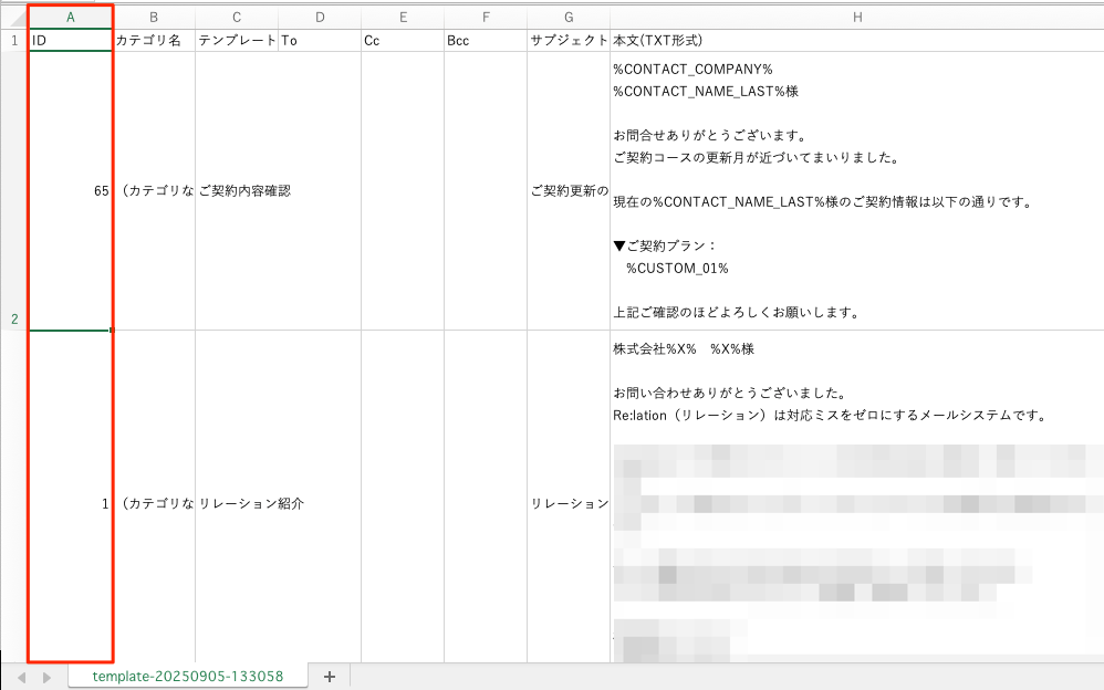 ・現在のテンプレート/フレーズを更新したい場合…1列目のIDが元のデータと同一となっているか確認ください。