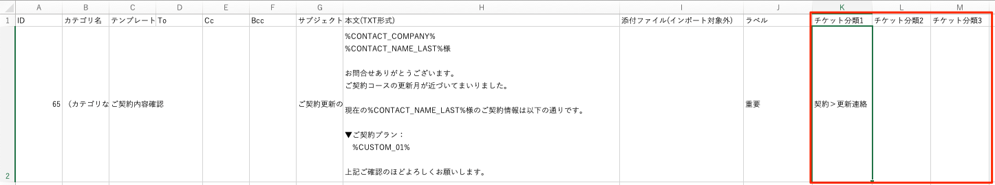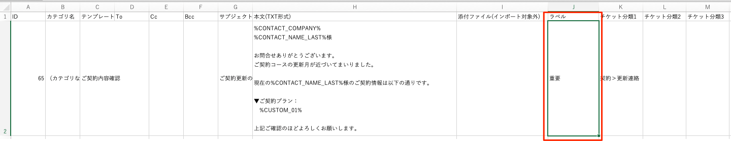 インポートしているファイルの「チケット分類」列に記載されているラベルデータが、対象の受信箱で登録されていないラベルの場合に表示されるエラーとなります。