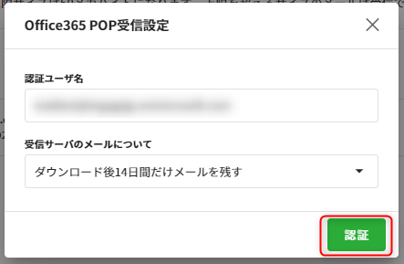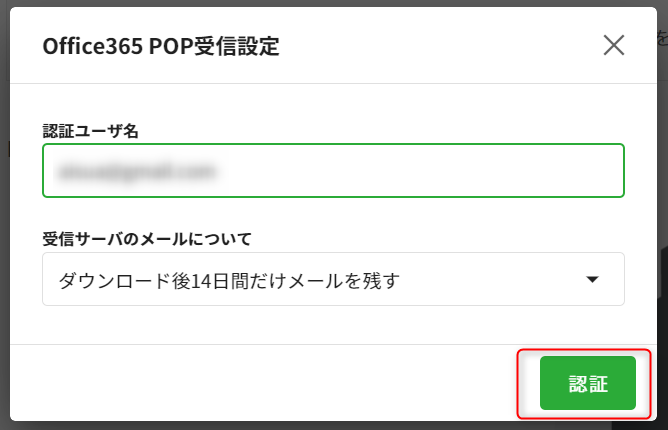 認証ユーザ名はMicrosoft Exchange Online(Office 365)アカウントのメールアドレスとなります。