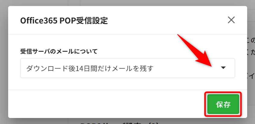 2.[受信サーバのメールについて]のプルダウンを変更し、[保存]を選択します。Microsoft Exchange Online(Office365)の共有メールボックスで運用する場合共有メールボックスで運用する場合、以下の手順で行います。