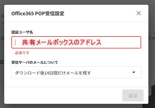 認証ユーザ名はMicrosoft Exchange Online(Office 365)の共有メールボックスのアドレスとなります。
