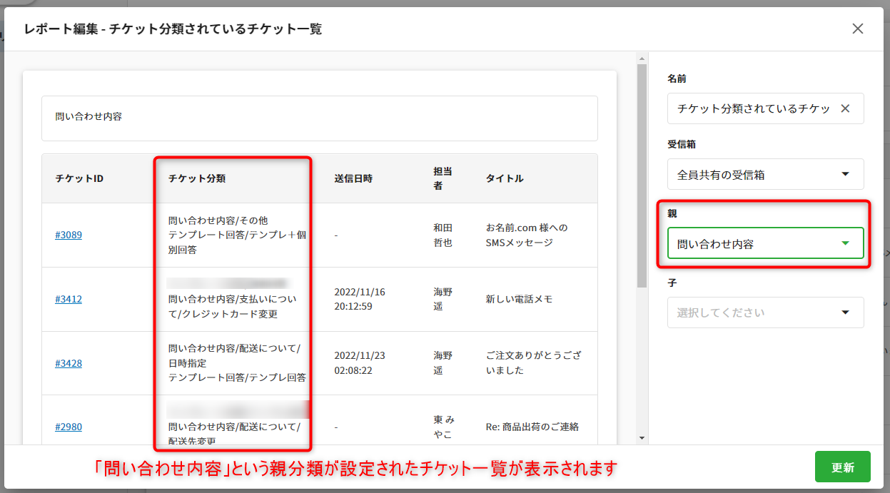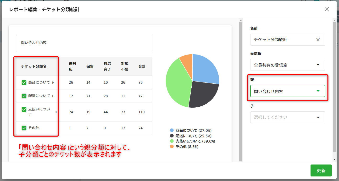 親・子のチケット分類を選択して更新すると、統計結果がレポートに反映されます。