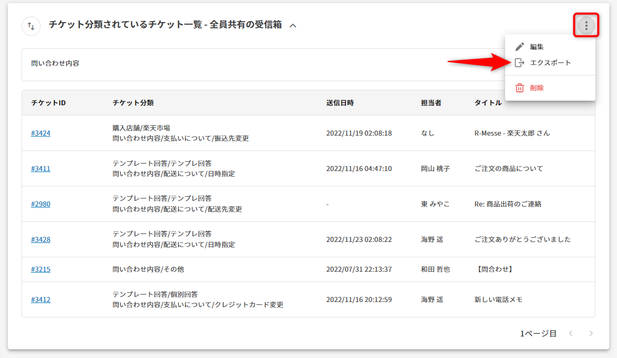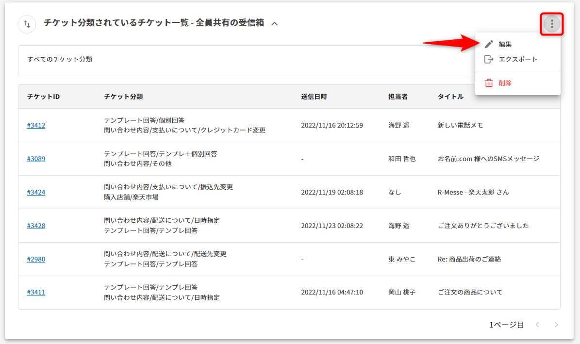 2.任意のチケット分類のみを表示する場合は、メニューアイコンから[編集]を選択します。