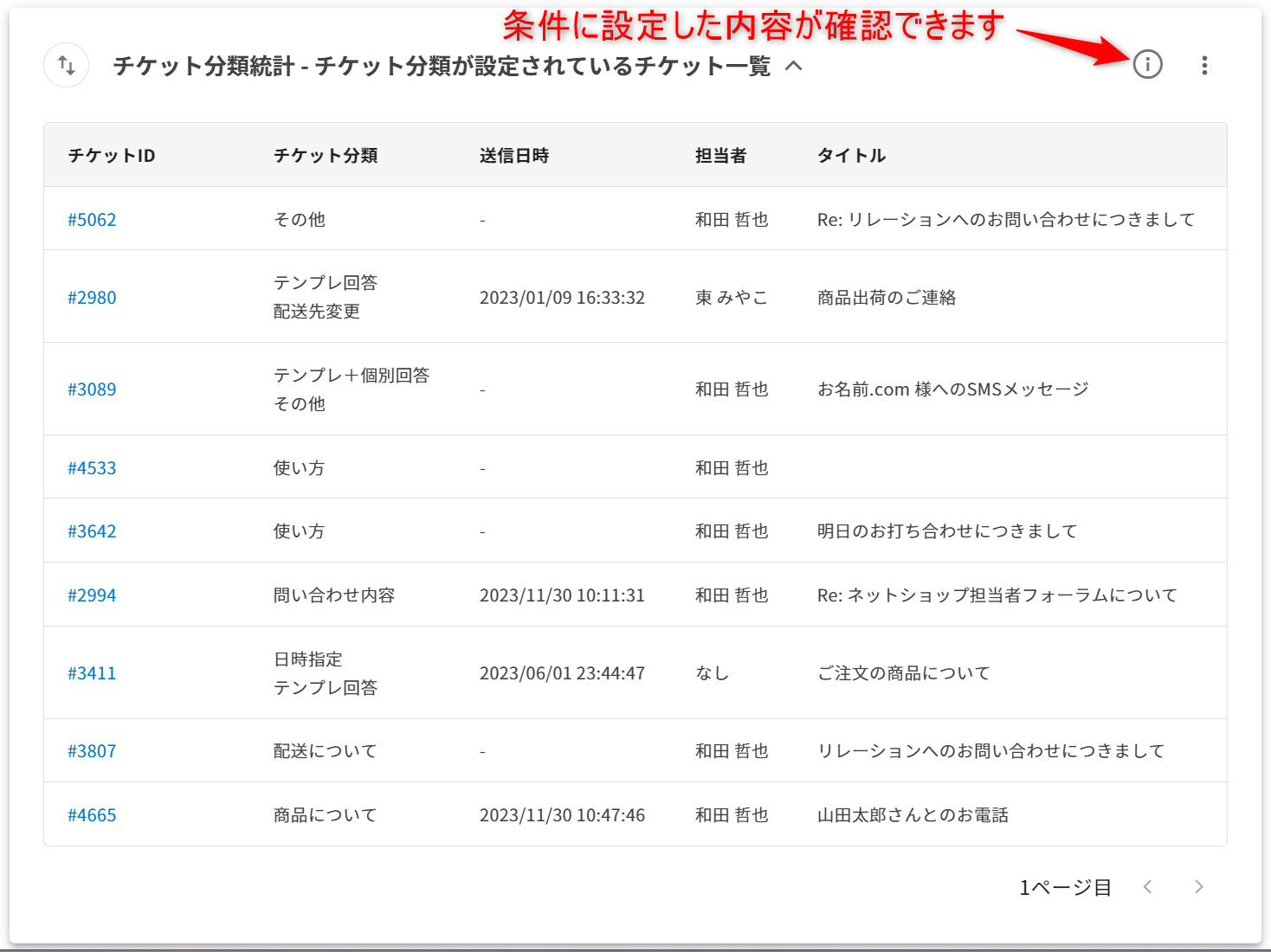 4.チケット分類名をクリックすることで、対象チケットの一覧に遷移できます。チケット分類が設定されているチケット一覧1.選択したチケット分類が設定されているチケットの一覧が確認できます。