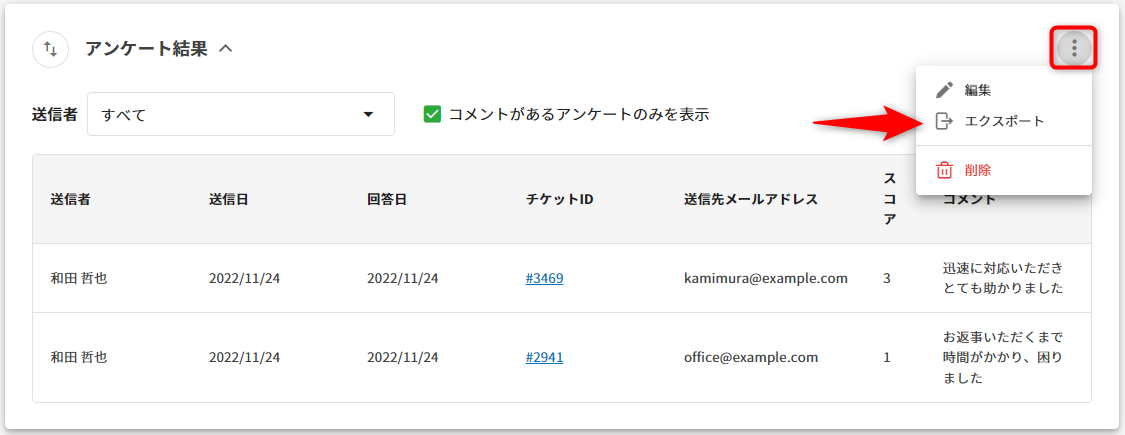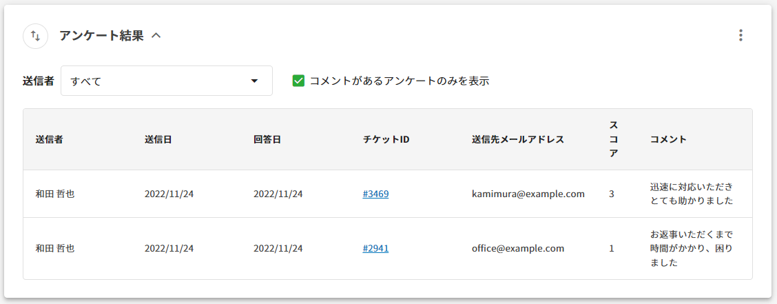 ※クリックすると該当のチケットを確認することが可能送信先アドレス アンケートの送信先メールアドレス スコア 1~3の3段階評価のスコア コメント 自由記入できる回答者からのコメント
