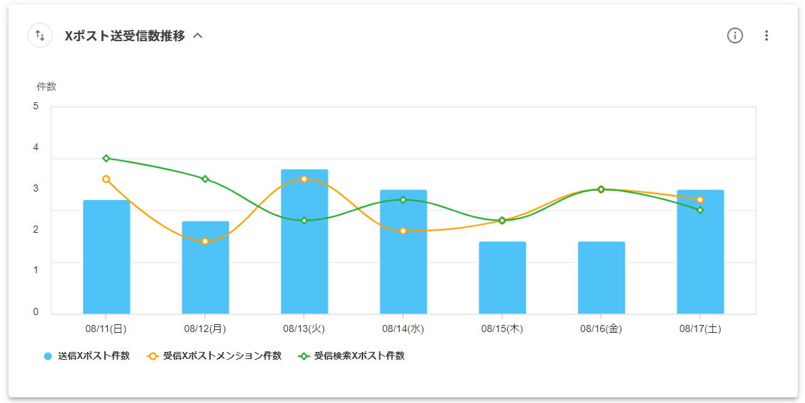 ・Xポスト送受信数推移算出条件下記メッセージにおいて全ての受信・送信メッセージを合計したものをグラフで表示します。