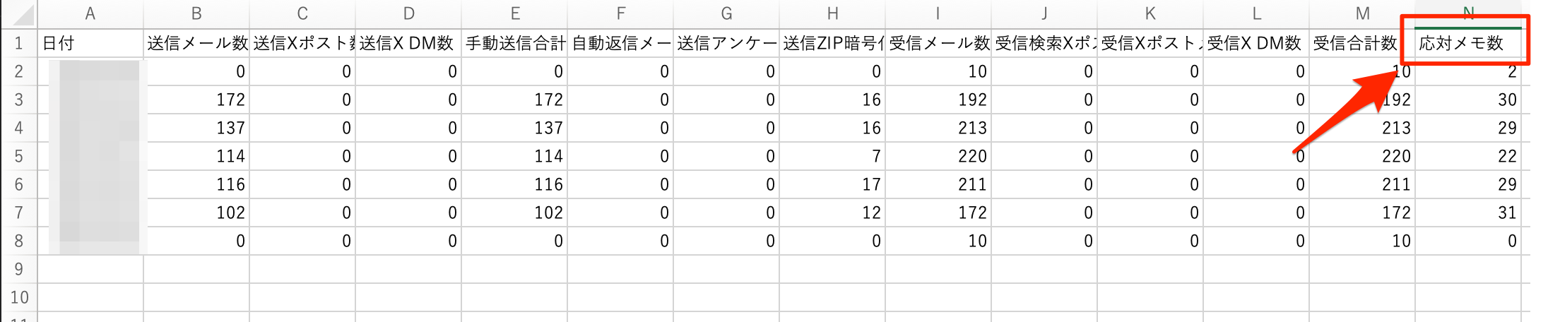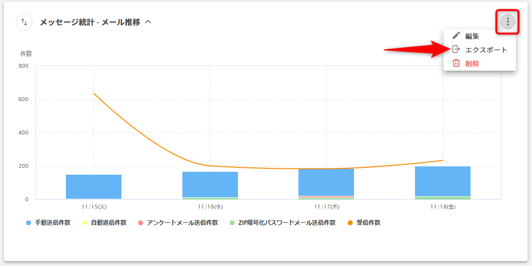 (例)「手動送信件数」のみ確認したい場合、「手動送信件数」のみ選択します。エクスポートするには応対メモ、X DMの合計数について「メッセージ統計」のグラフには表示されていませんが、エクスポートすることにより期間に作成された応対メモ、X DMの合計数を確認することができます。