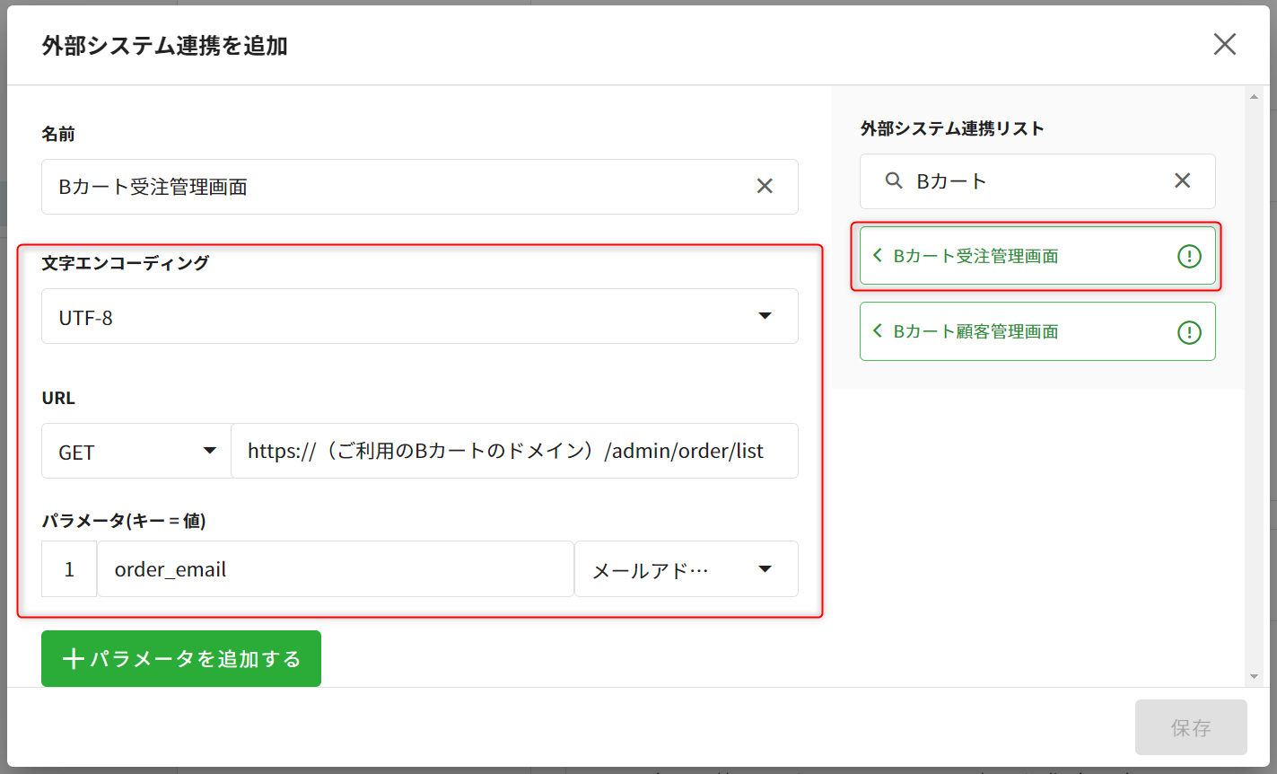・基本設定名前 好きな名前を入力してください。(例: Bカート受注管理) 文字エンコーディング UTF-8 送信方法 (HTTP Method) GET URL https://(ご利用のBカートのドメイン)/admin/order/list