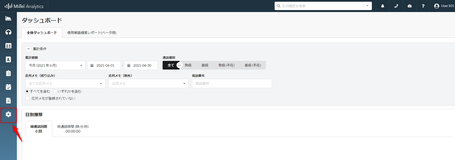 外部システム連携の設定の詳細については 外部システム連携を設定するには を参照ください。 下記の設定を順にします。MiiTel連携設定1.MiiTel Analytics で画面左側ギアアイコンより [設定]をクリックします。