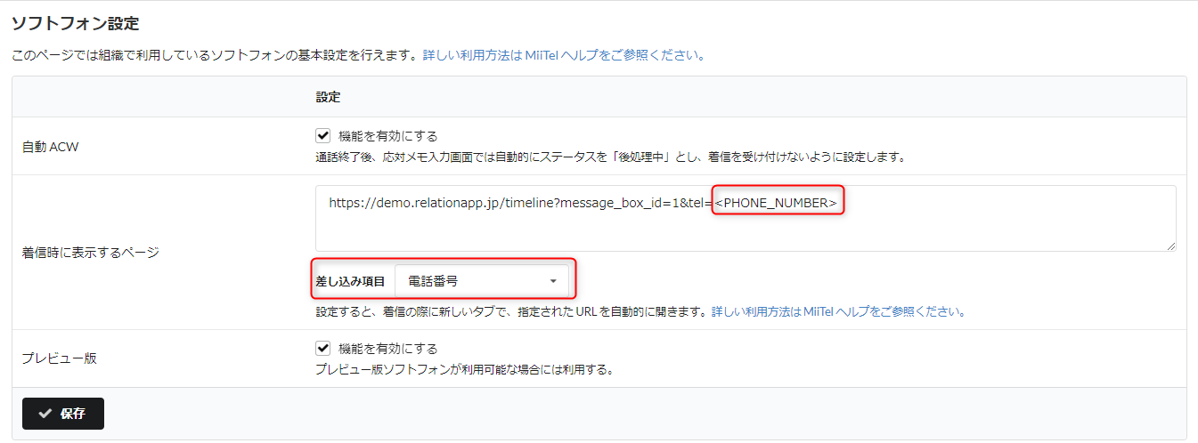 5.[保存] ボタンをクリックします。補足・設定の変更を行った場合は、ご利用の MiiTel Phone を再読み込みしてください。