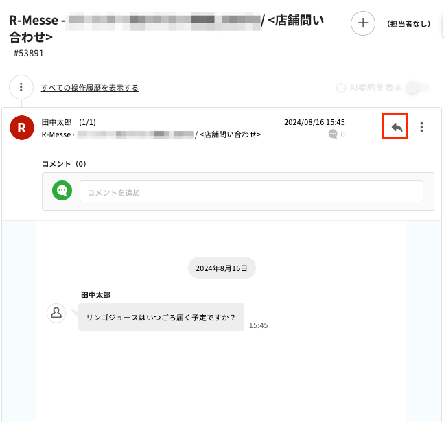 1.その他チャネルの返信方法と同様、チケット詳細画面の返信アイコンを選択