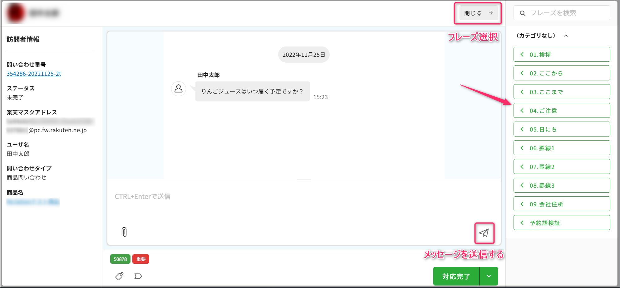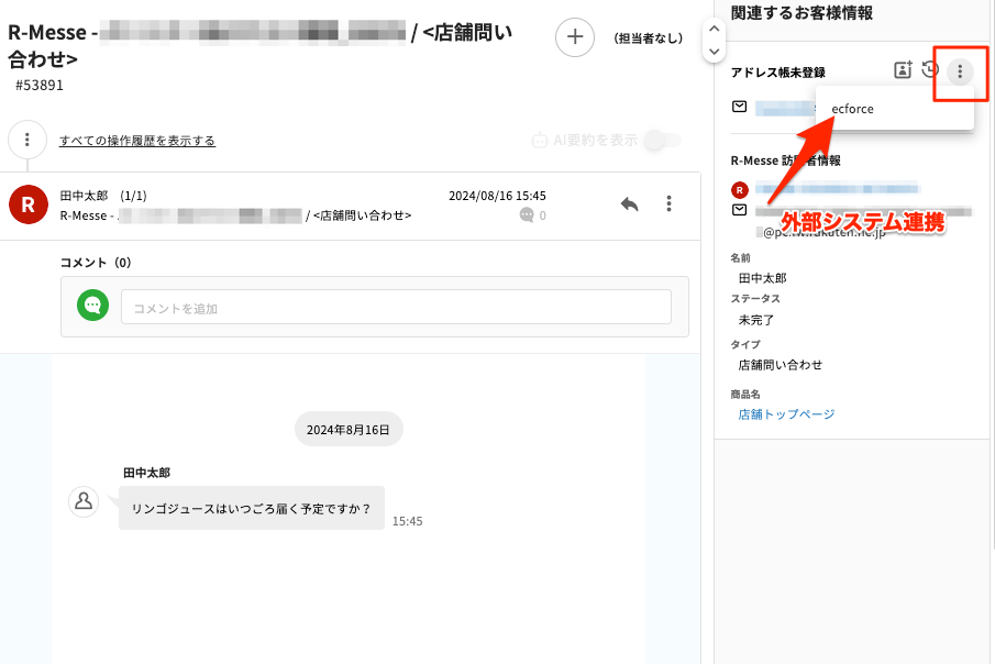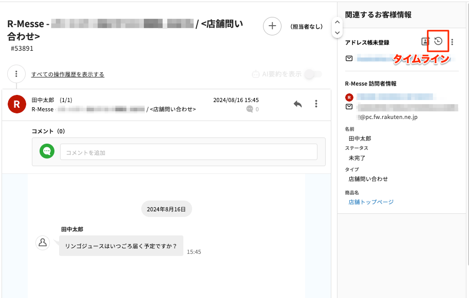 R-Messeからのメッセージを受信すると、チケット詳細画面に[関連するお客様情報]が表示されます。