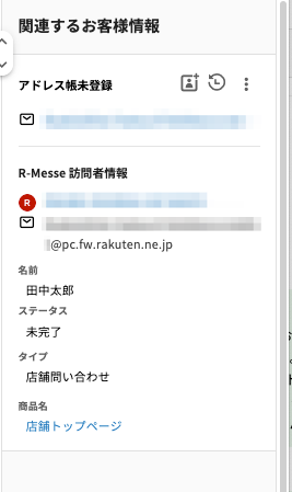 表示される項目は以下の通りです。※存在しない場合は表示されません。項目名 表示内容 問い合わせ番号 RMS問い合わせ管理へのURLリンク 名前・アドレス お客様のお名前と、楽天マスク化アドレス ステータス 完了・未完了 カテゴリ 問い合わせカテゴリ タイプ 問い合わせタイプ 注文番号 商品番号 商品名 URLリンク 楽天からの通知メールについてR-Messeからのメッセージを受信した際、楽天からのお問い合わせ通知メールもRe:lationに受信するよう設定している場合、