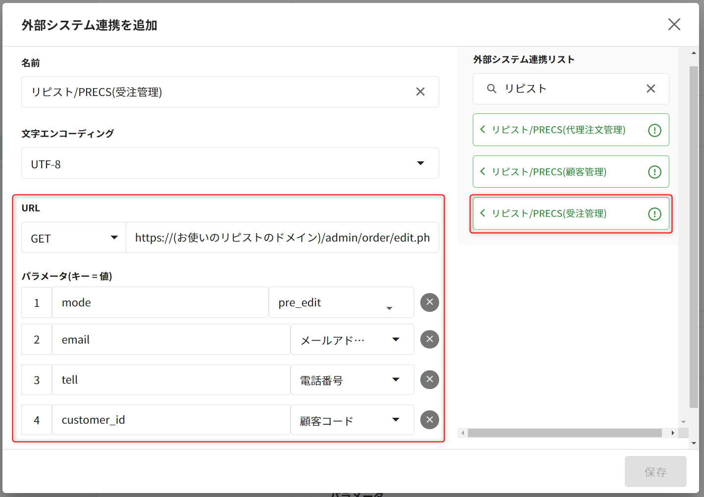 ・基本設定名前 好きな名前を入力してください。(例: リピスト/PRECS /リピストX受注管理画面) 文字エンコーディング UTF-8 送信方法 (HTTP Method) GET URL https://(お使いのサービスのドメイン)/admin/order/edit.php?mode=pre_edit&