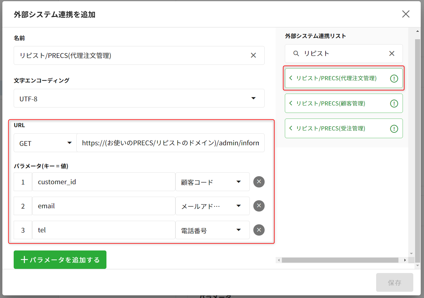 ・基本設定名前 好きな名前を入力してください。(例: リピスト/PRECS /リピストX 顧客管理画面) 文字エンコーディング UTF-8 送信方法 (HTTP Method) GET URL https://(お使いのサービスのドメイン)/admin/customer/edit.php ・パラメータ