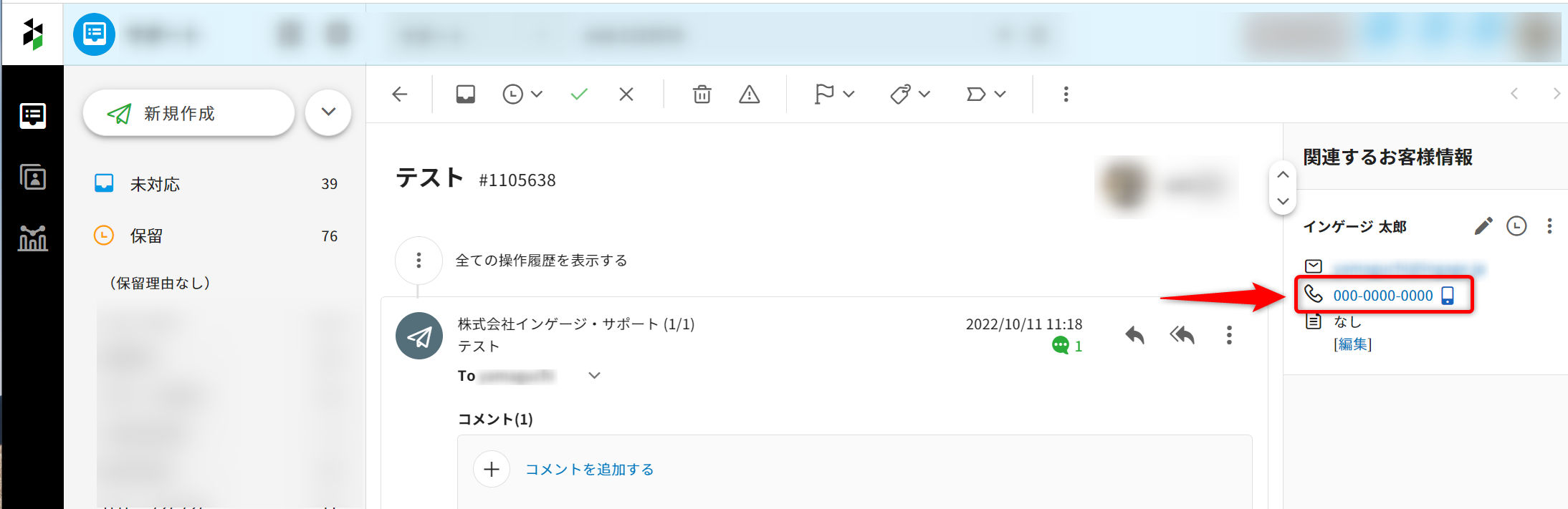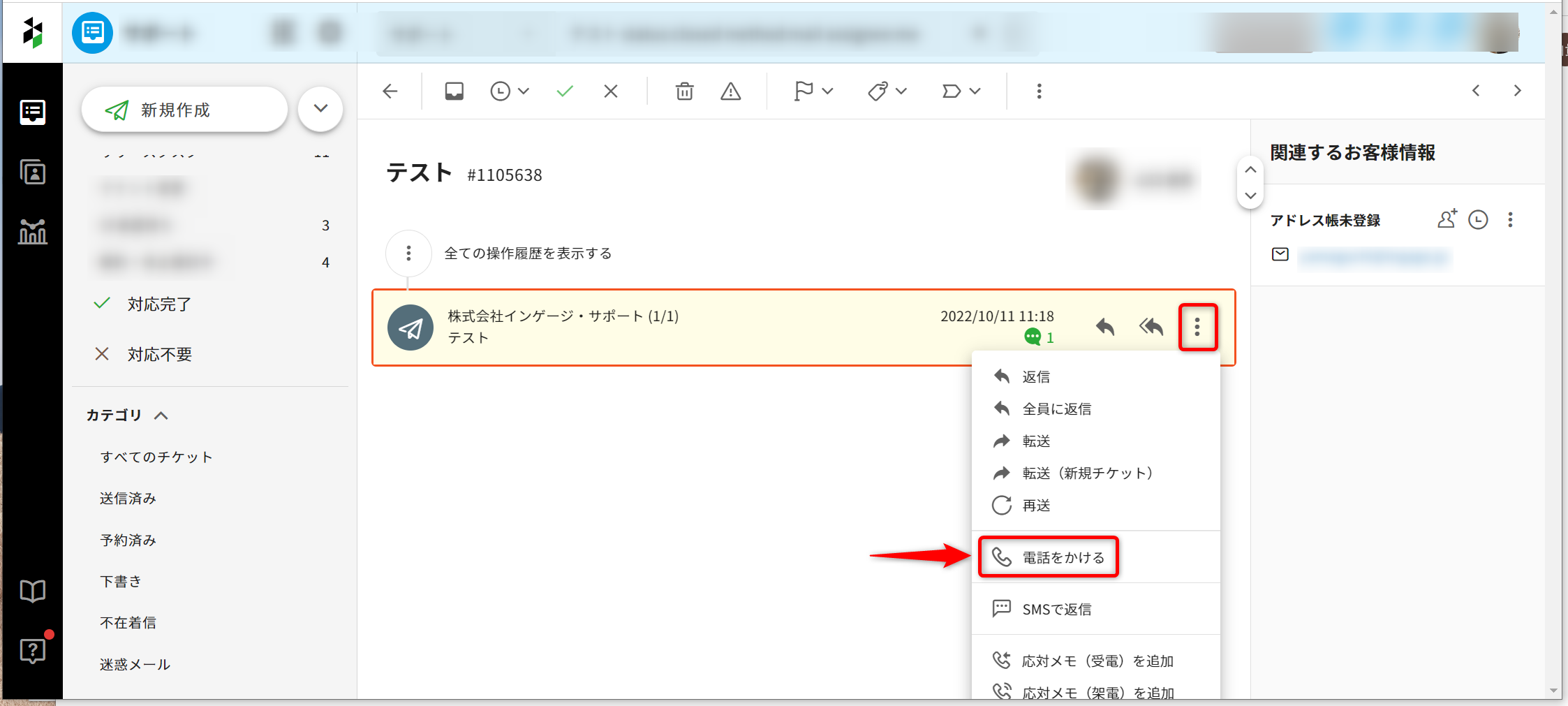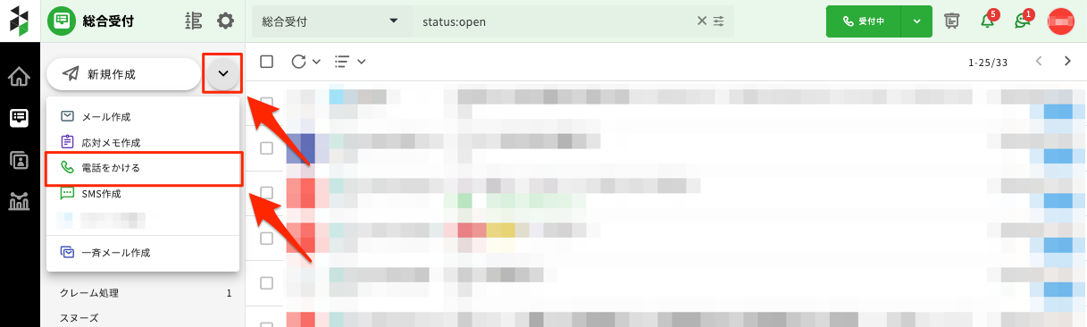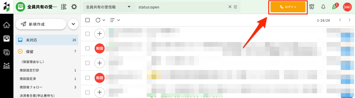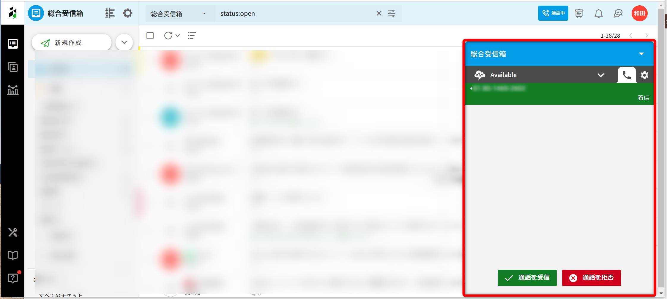 3.対応中の受信箱内で、通話先番号が一致するメッセージを含むチケットが一覧表示されます。