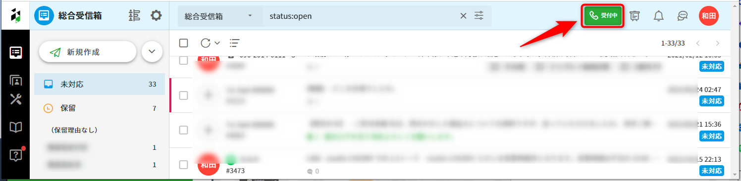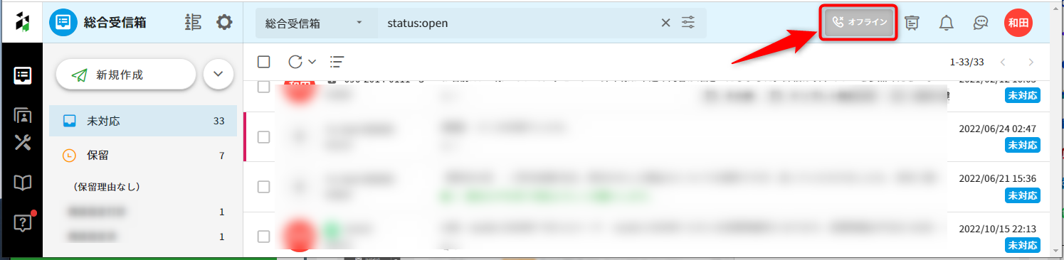 3.クラウド電話にログイン後、Re:lation画面上部に表示される[受付中][オフライン]ボタンによって電話の受付状態を確認・変更できます。