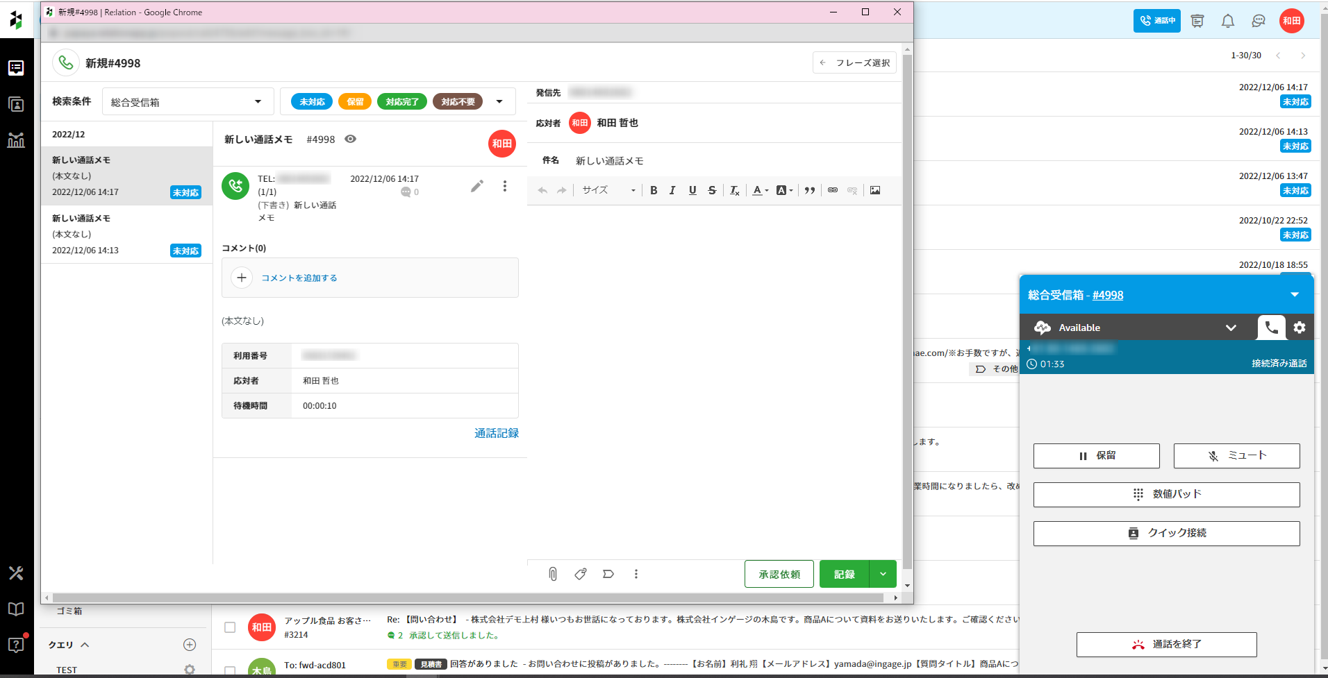 ※通話メモは電話を開始した受信箱で作成されます。