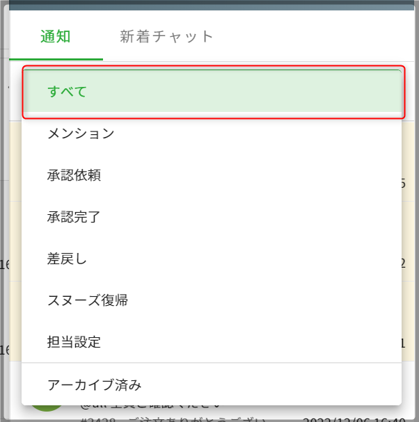 また、右上の×ボタンを押すと通知の一覧表示を閉じることができます。通知の絞り込みについて通知一覧内で、以下の通知の種類を絞り込んで閲覧することが可能です。