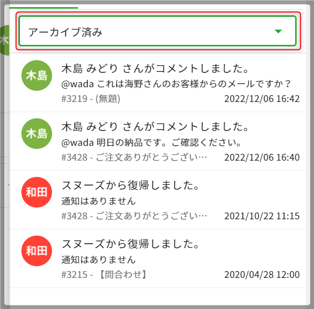 アーカイブ済通知を確認する場合は、[アーカイブ済]でソートすると確認することができます。一度アーカイブした通知を通知一覧に戻すにはアーカイブ済の通知一覧に戻したい通知にカーソルを合わせると、 右上にフォルダアイコンが表示されます。