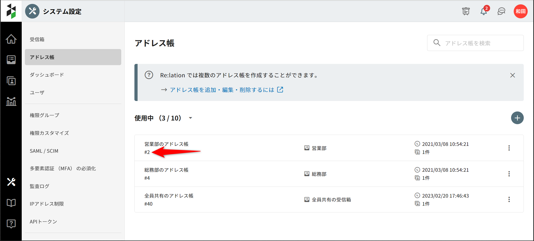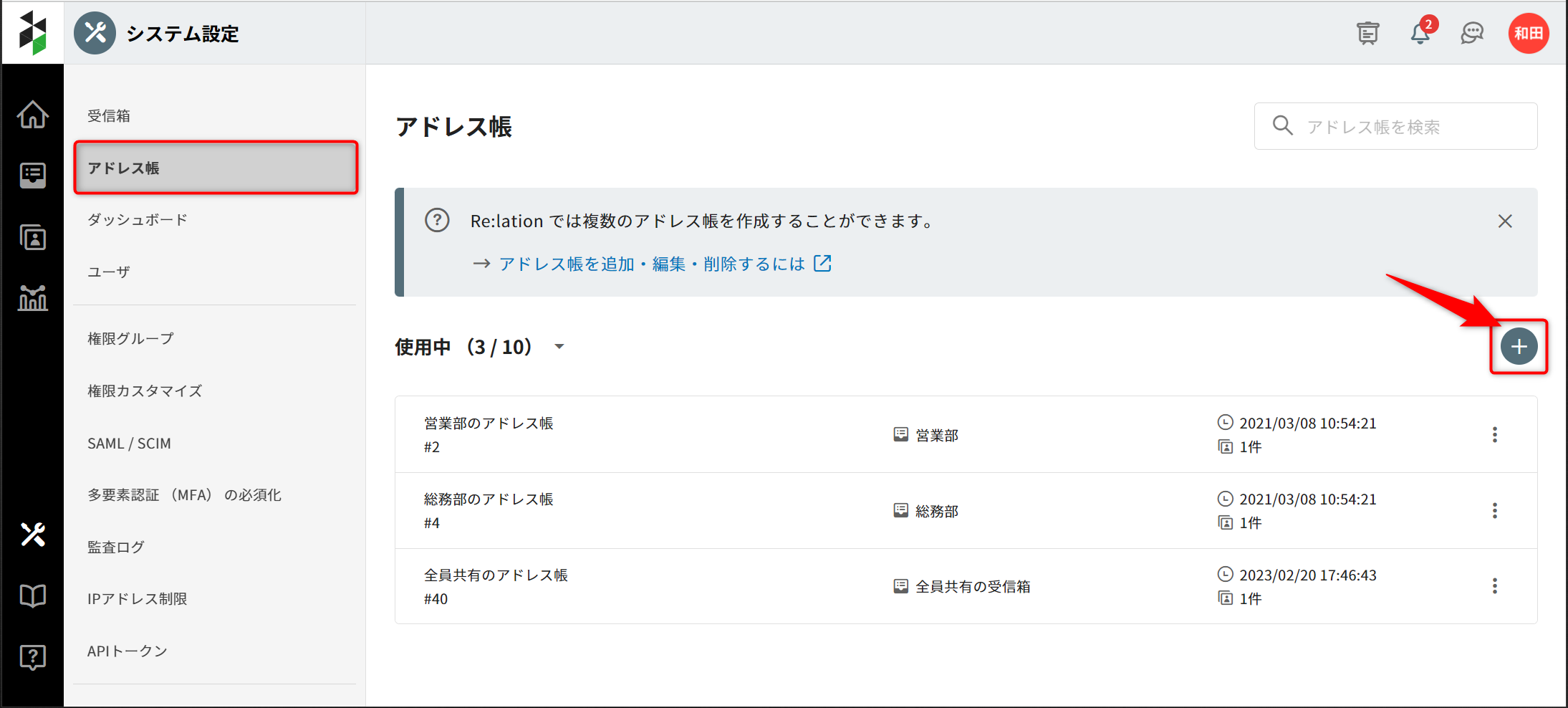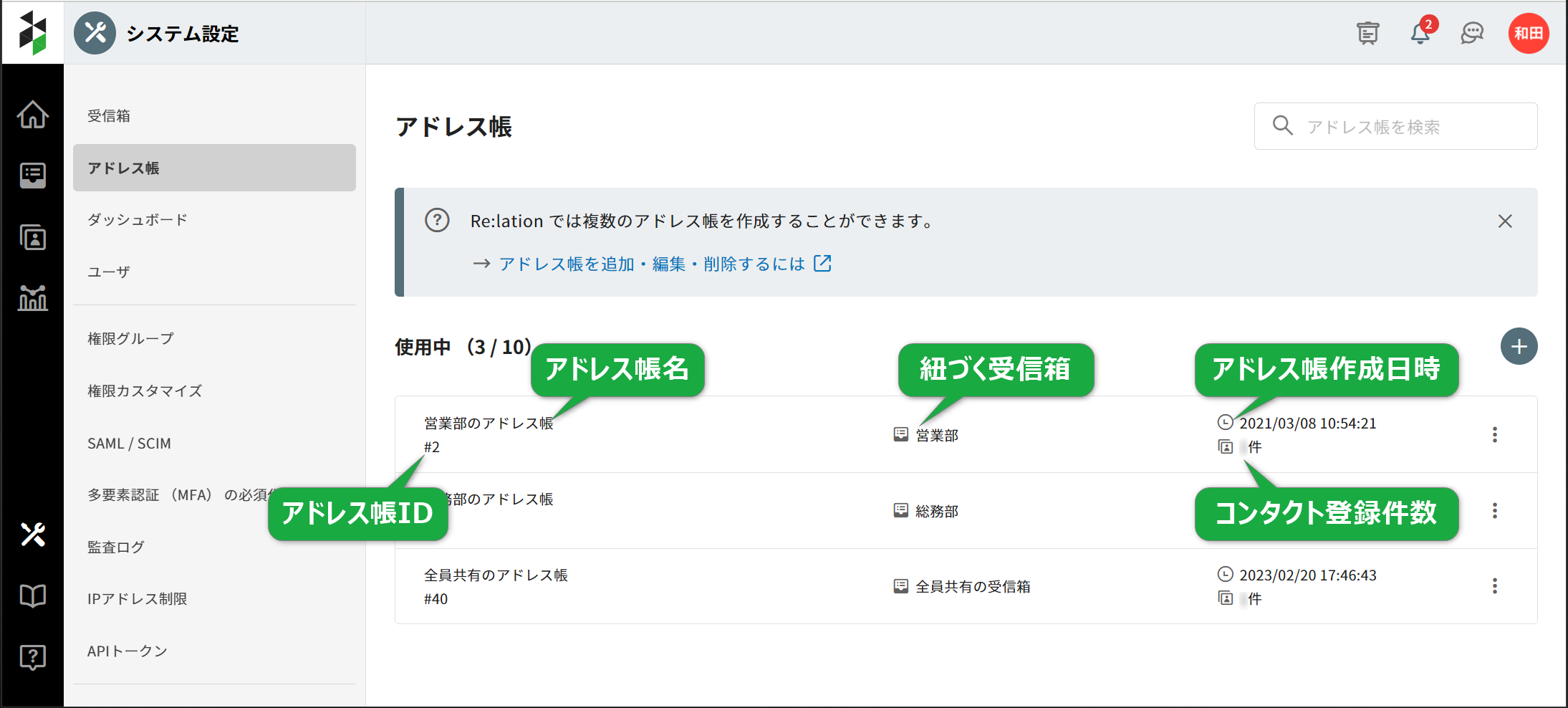 Re:lation では複数のアドレス帳を作成することができます。
