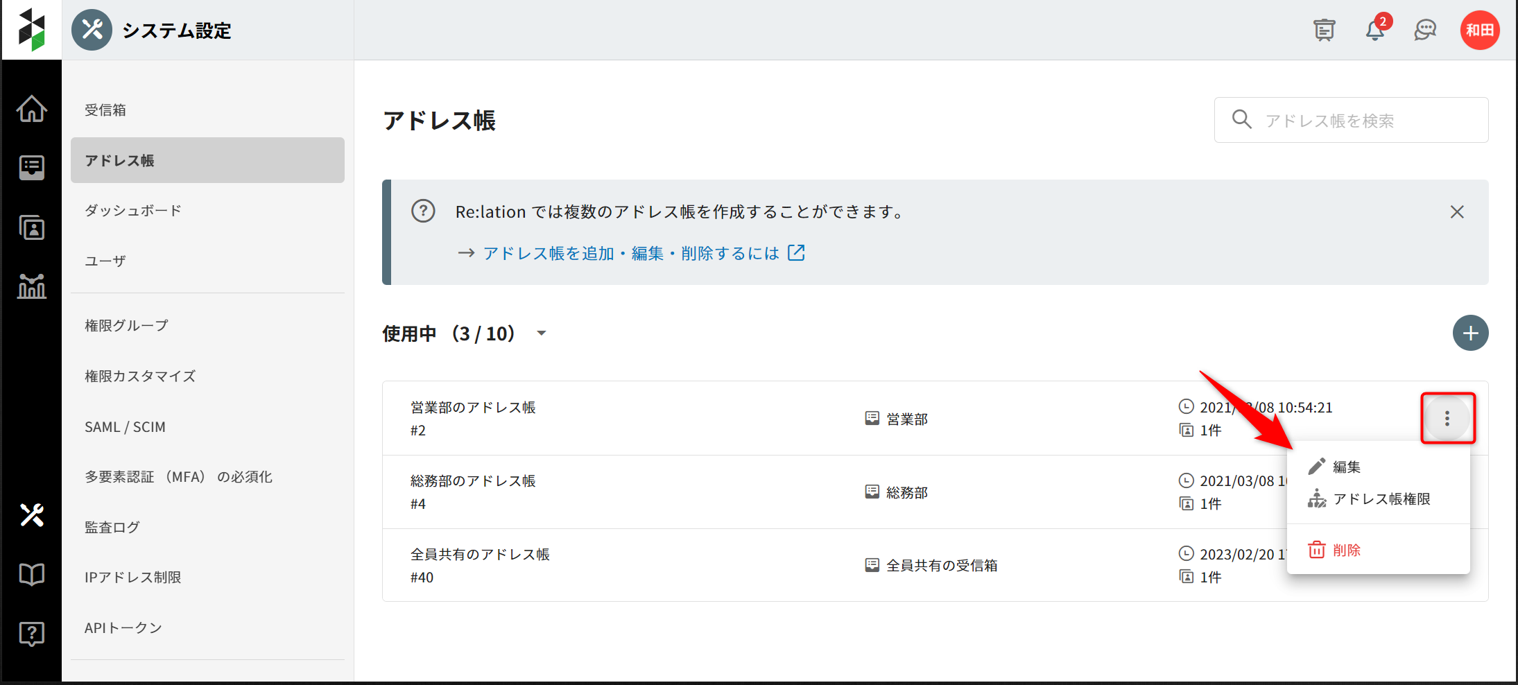 2.アドレス帳の名前を変える場合は、アドレス帳の右側メニューアイコンより、[編集する]を選択します。