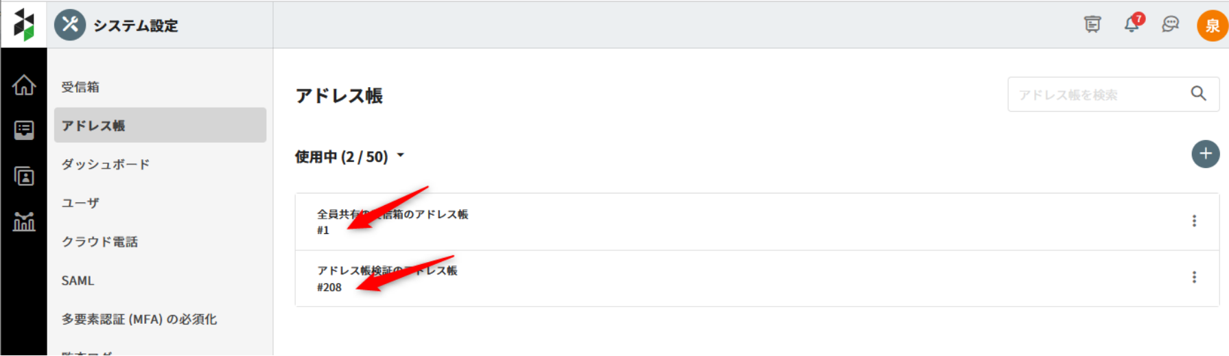 画面右上のユーザアイコン>[システム設定]>アドレス帳に表示されている、各アドレス帳のidが<customer_group_id>です。