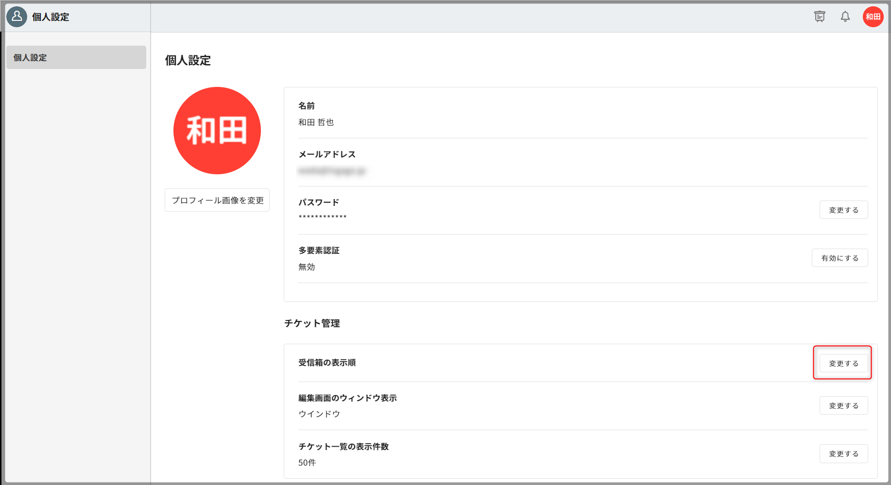 受信箱の表示順を変更する方法(チケット管理メニューから)