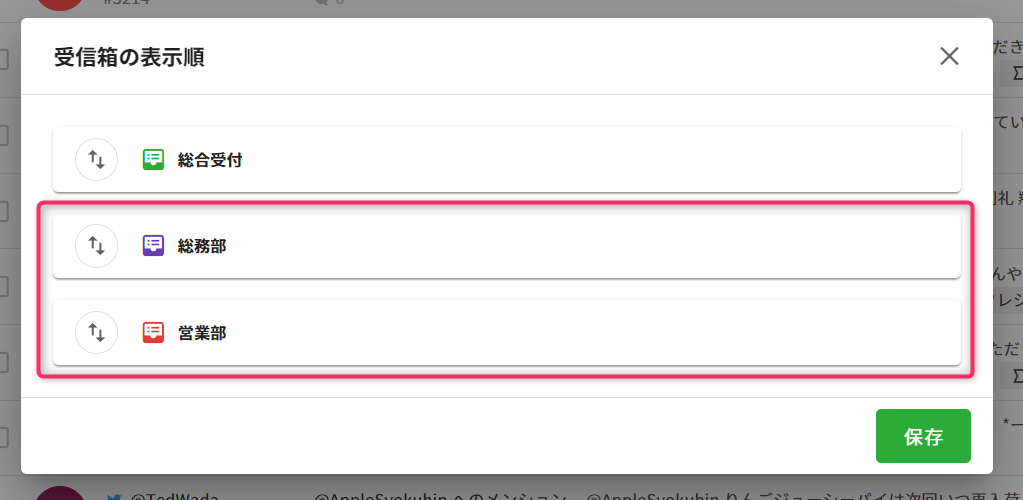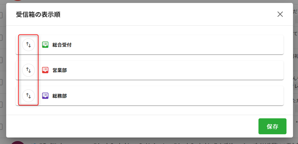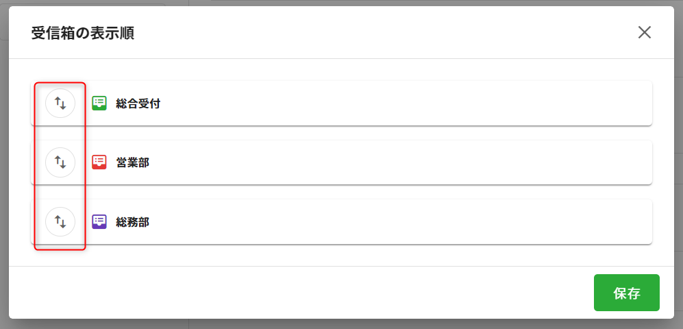 3.ポップアップで受信箱が一覧表示され、[↑↓] 部分にカーソルを移動させると Drag & Drop で入れ替えできます。