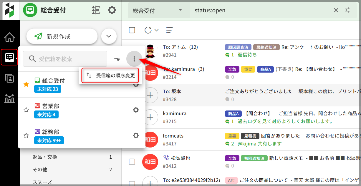 1.[チケット管理]のメニューアイコンをクリックし、[受信箱の順序変更]を選択します。