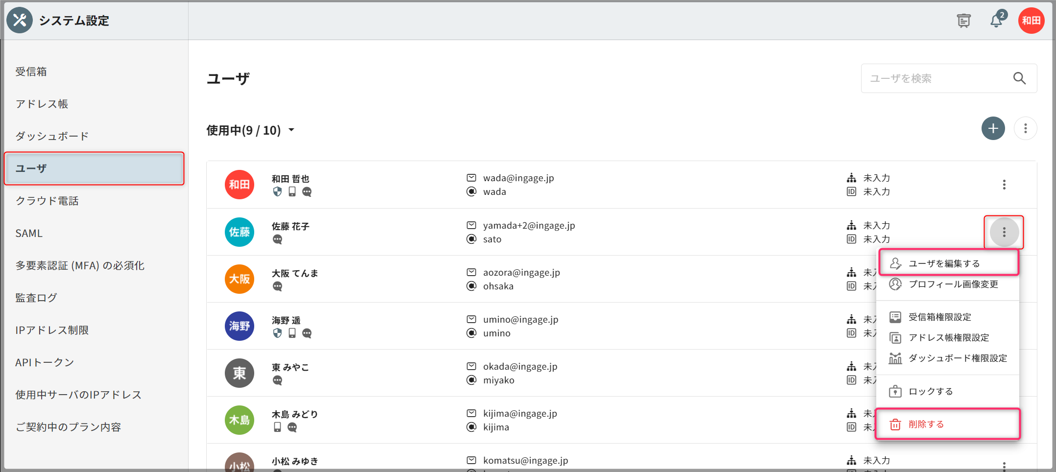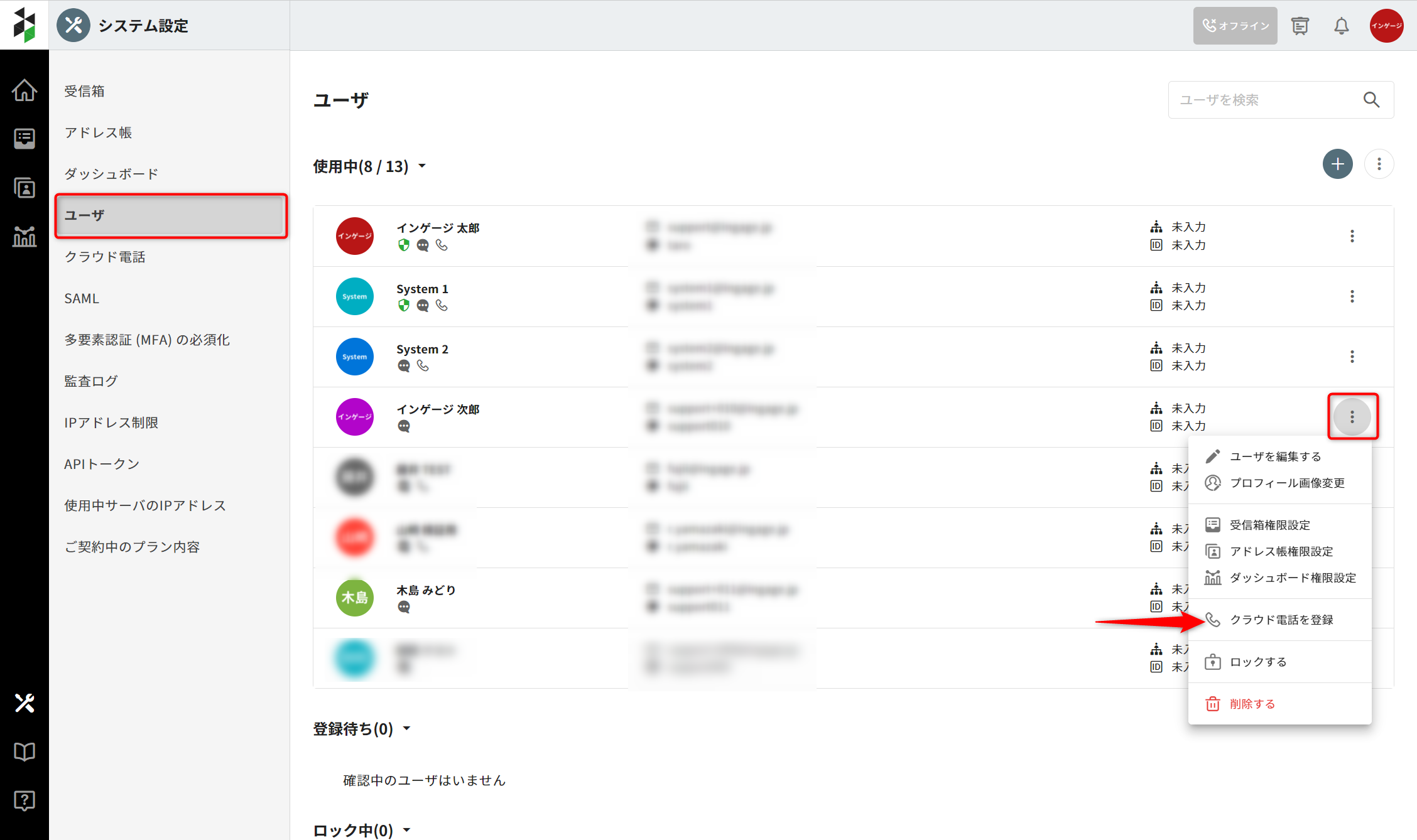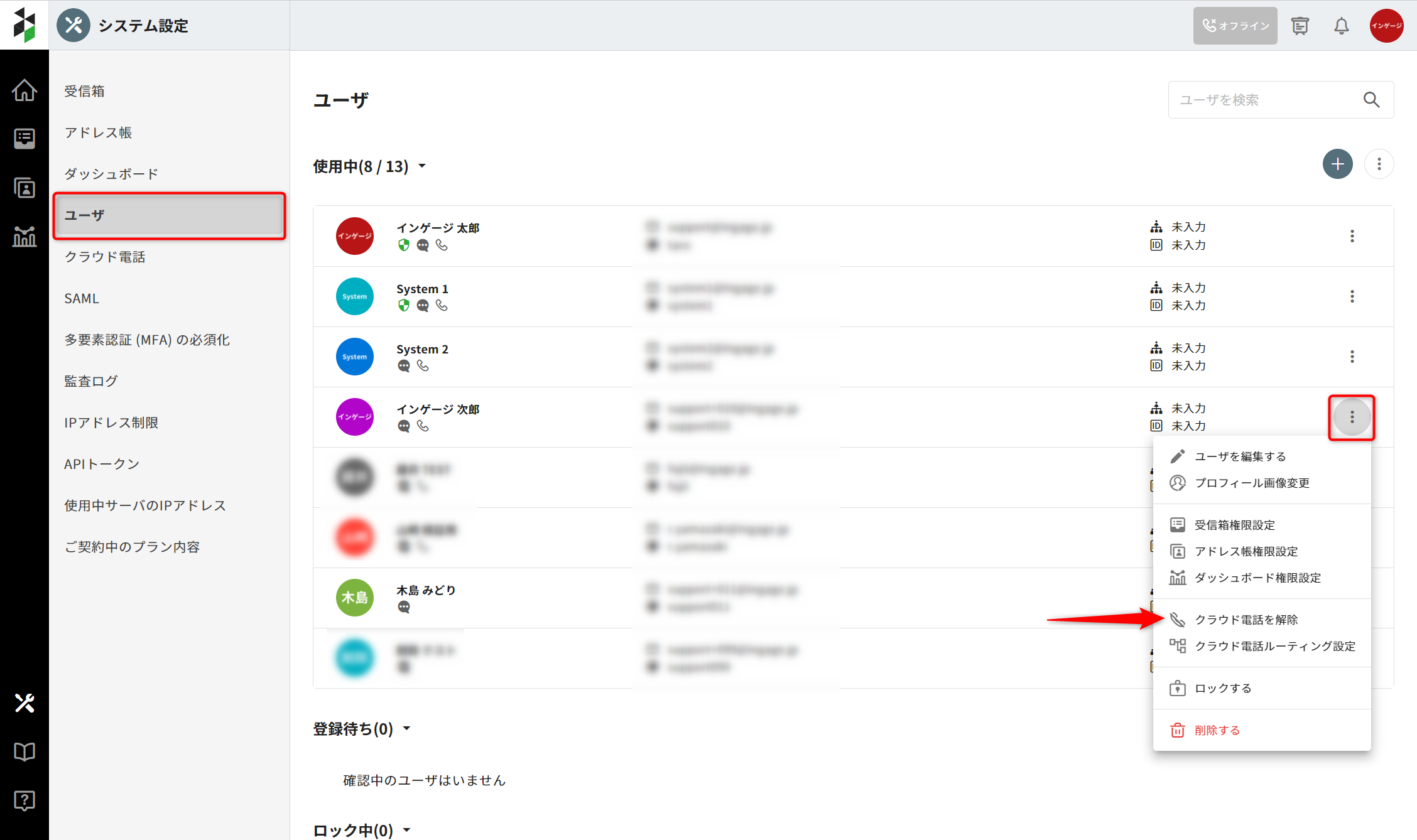 ・オプションの解約はサポートチャットまたはsales@ingage.jpまでご連絡ください。1.[システム設定]より、[ユーザ]を選択した後、クラウド電話利用を解除したいユーザのメニューアイコンより、[クラウド電話を解除]を選択します。