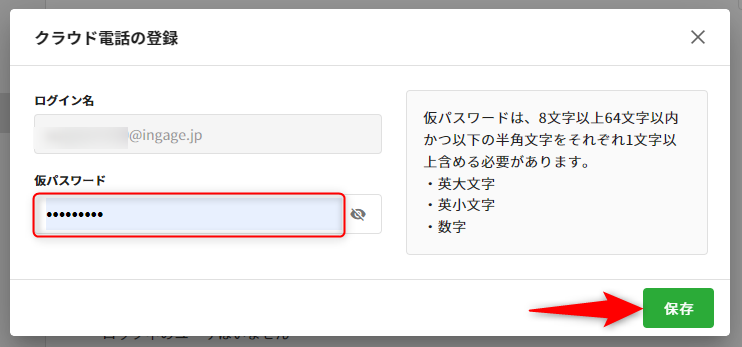 ・オプションのお申込みはサポートチャットまたはsupport@ingage.jpまでご連絡ください。3.クラウド電話の登録画面にて「仮パスワード」を入力し、[保存] をクリックしてください。