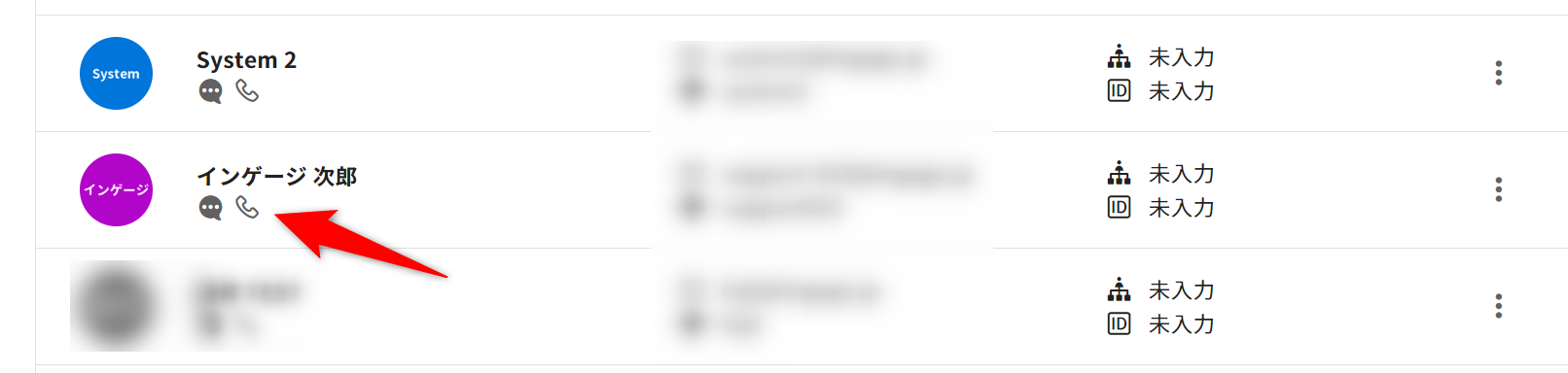 4.「ユーザ」画面では先ほどクラウド電話機能を追加したユーザーに電話マークが表示されます。