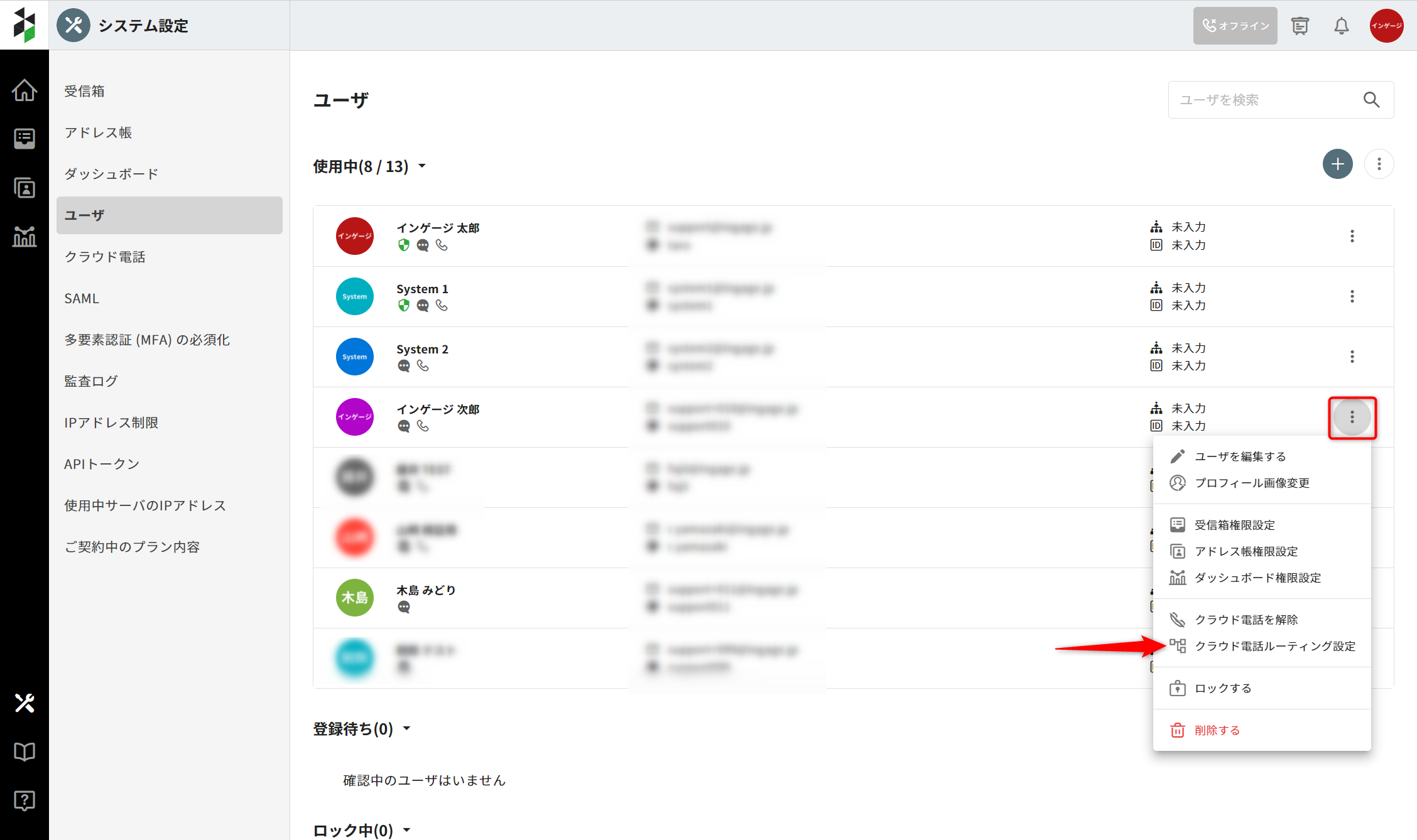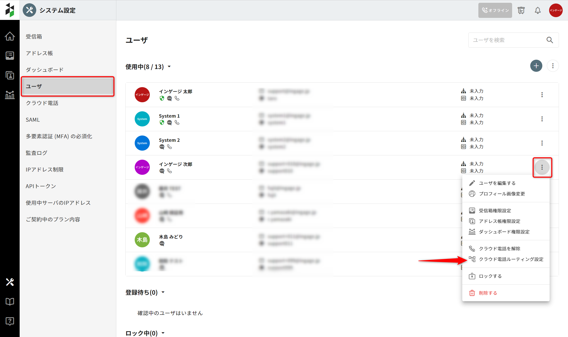 1.[システム設定]より、[ユーザ]を選択した後、ルーティング設定を変更したいユーザのメニューアイコンより、[クラウド電話ルーティング設定]を選択します。