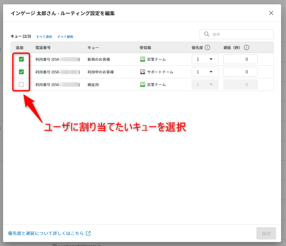 6.利用番号ごとに紐づいているキューが表示されるため、ユーザに割り当てたいキューを選択し、[保存] をクリックしてください。