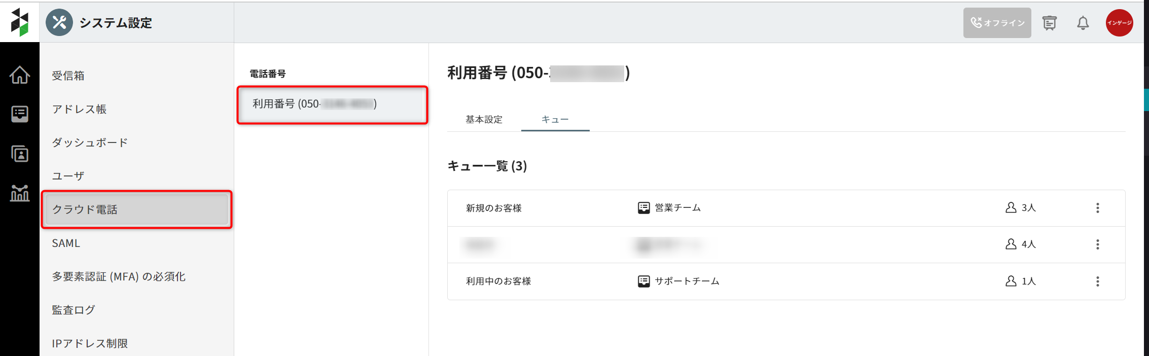 ユーザに割り当てたいキューと紐づいている受信箱に権限がない場合、受電できませんのでご注意ください。クラウド電話利用ユーザの解除をするにはクラウド電話が不要になったユーザは、利用を解除できます。