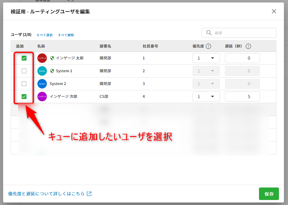 3.キューにユーザを追加したい場合は[ユーザを追加]より追加したいユーザを選択し、保存します。
