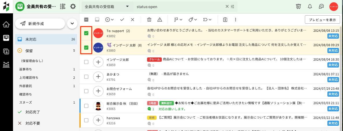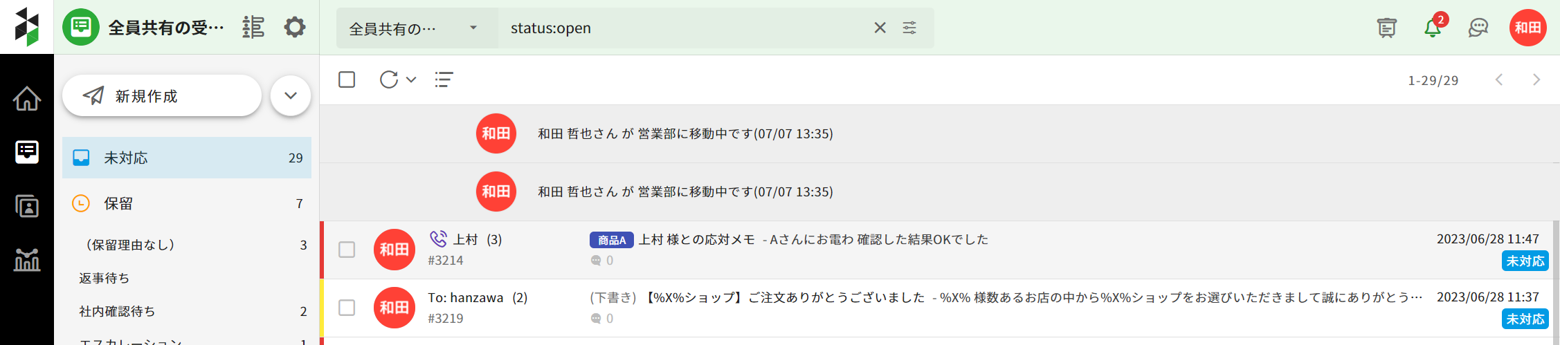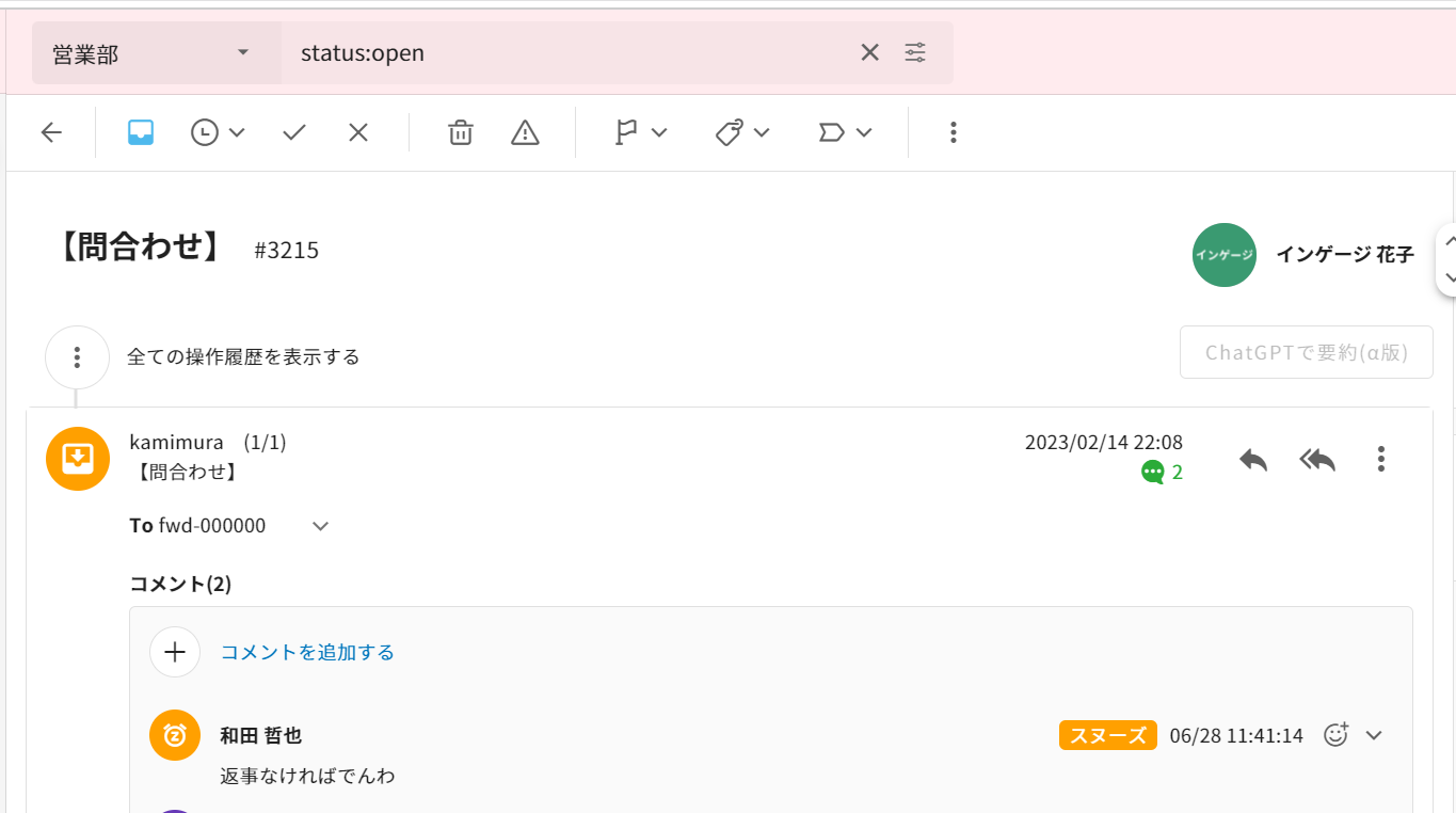 例)「全員共有の受信箱」で「インゲージ花子」に担当者設定されているチケットを、「営業部」「総務部」受信箱にそれぞれ移動した場合