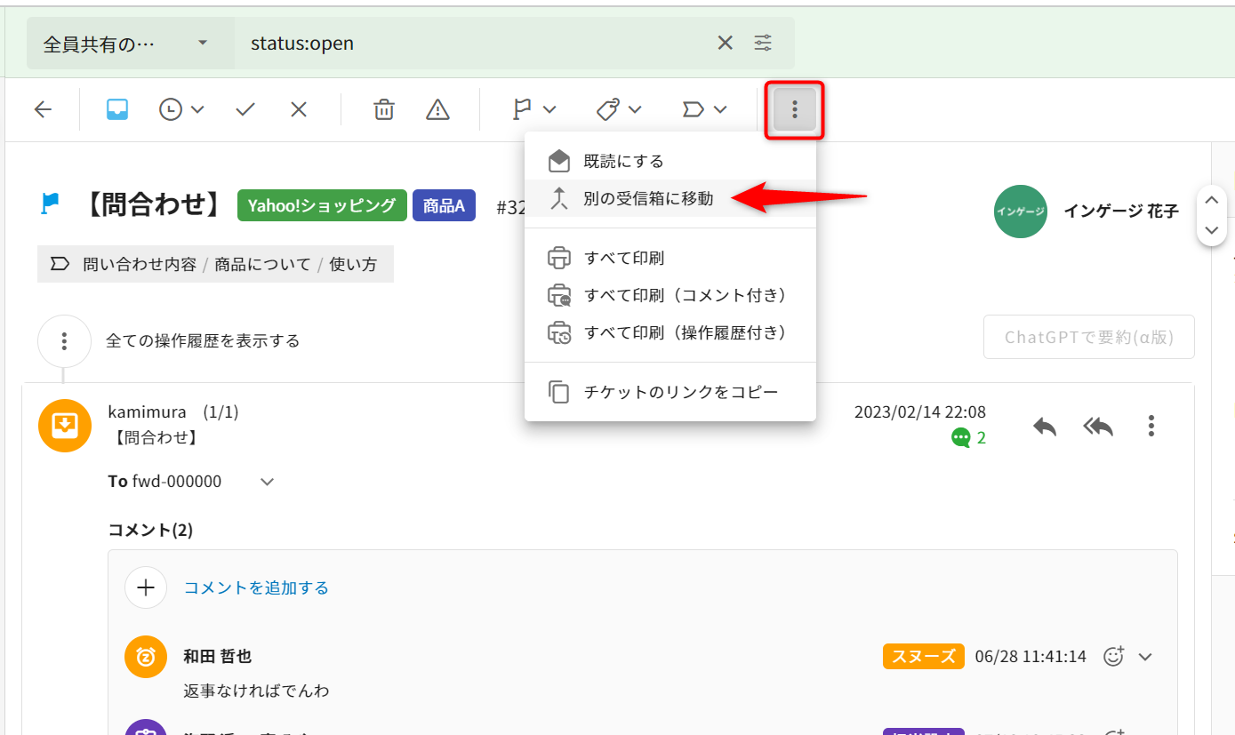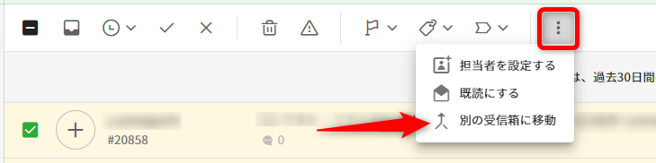 1.移動したいチケットを選択し、上部のメニューアイコン[…]をクリックし、[別の受信箱に移動]を選択します。