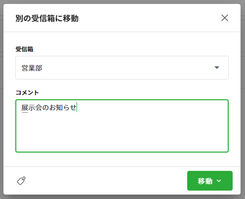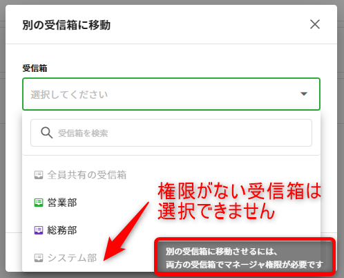 ・別の受信箱へのチケットに移動するには両方の受信箱で[マネージャ]以上の権限が必要です。