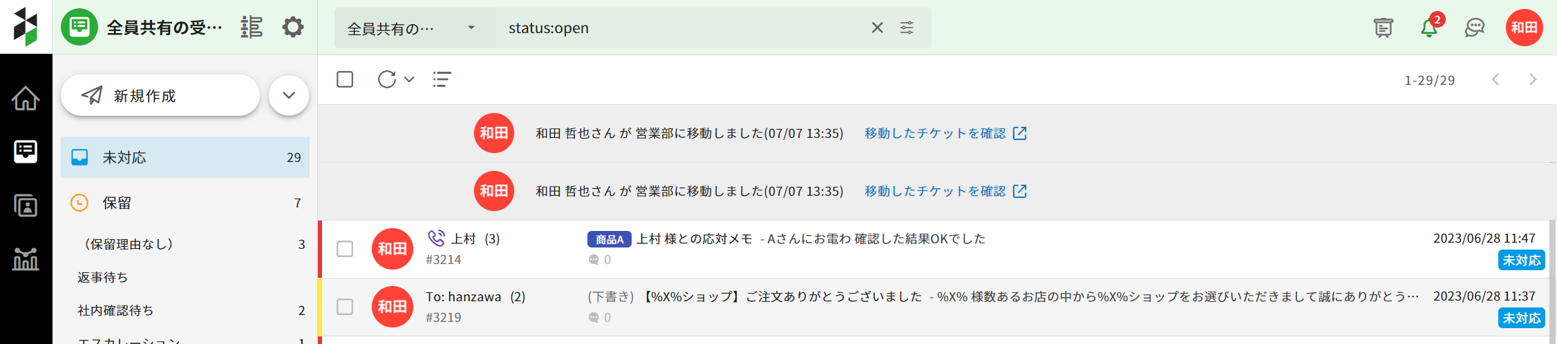 よくあるご質問 >Re:lationの機能・設定 >メール管理 >チケットを別の受信箱に移動するには