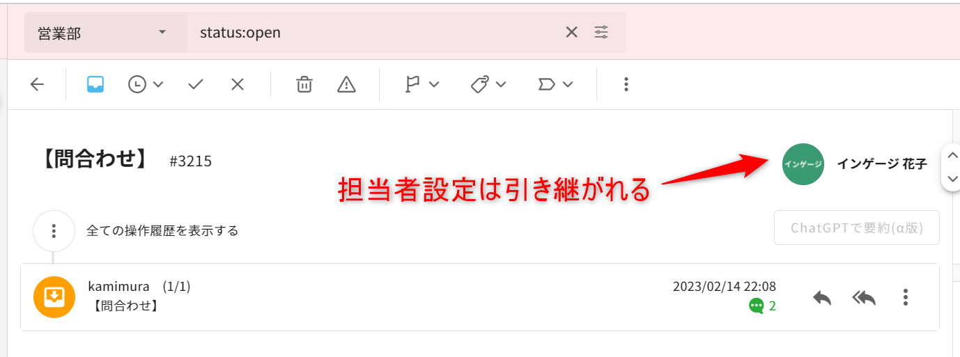 チケットを別の受信箱に移動した場合、担当者設定されているユーザが移動先受信箱でもアシスタント以上の権限を持っていれば、担当者を保持したまま移動が可能です。