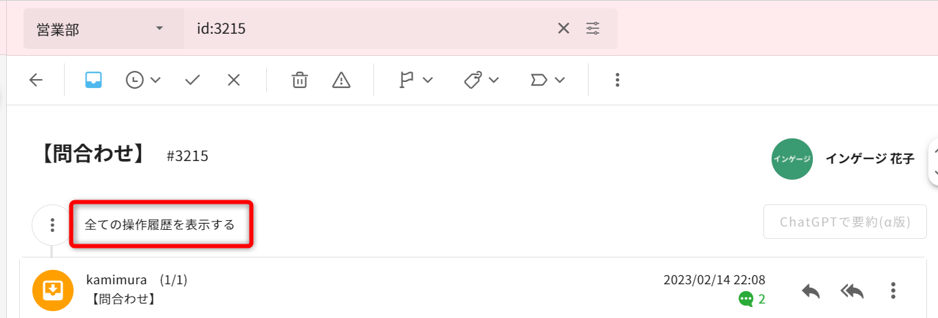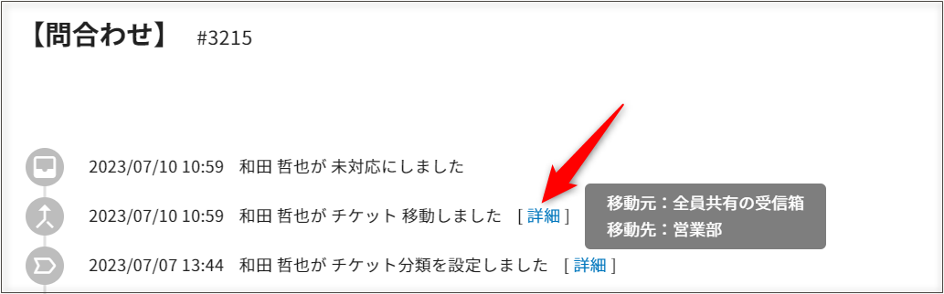 チケットを別の受信箱に移動した場合、チケット詳細画面の[全ての操作履歴を表示する]をクリックすると、チケット移動についての履歴が確認できます。