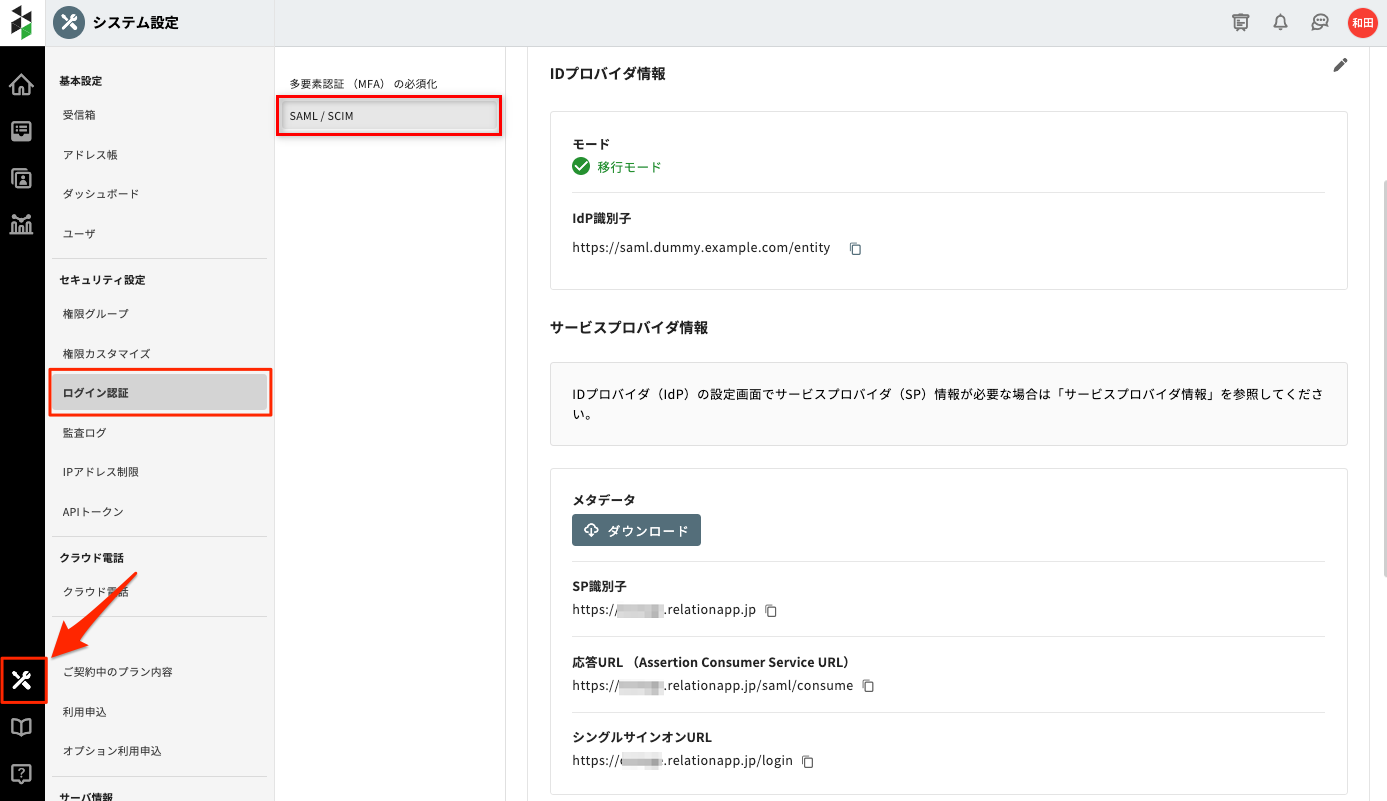1.Re:lation画面左下のツールアイコンより[システム設定]>[ログイン認証]>[SAML/SCIM]をクリックします。