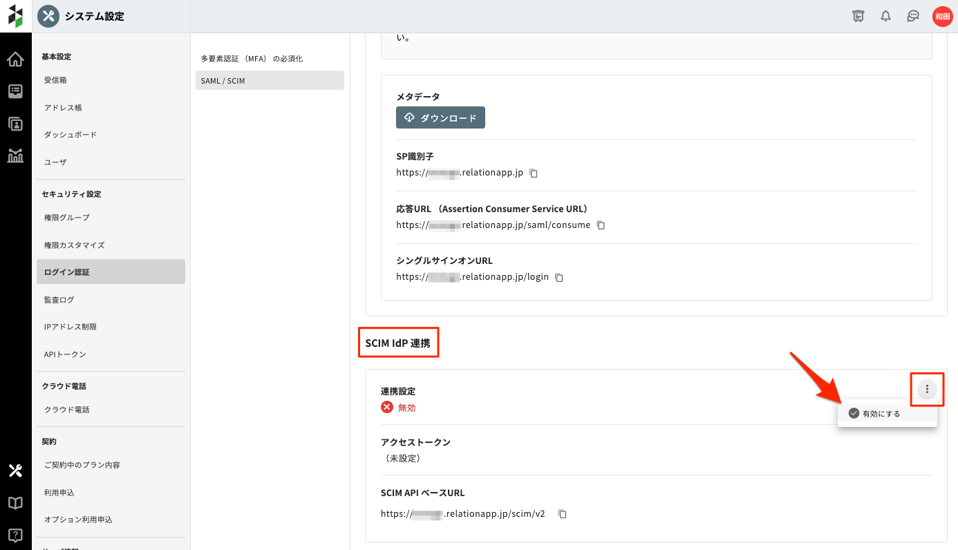 2.ページを下までスクロールし、[SCIM IdP連携]のメニューアイコン[…]より、「有効にする」をクリックします。