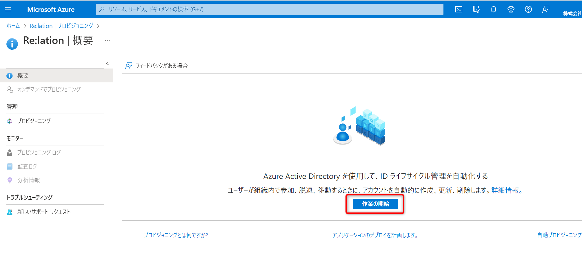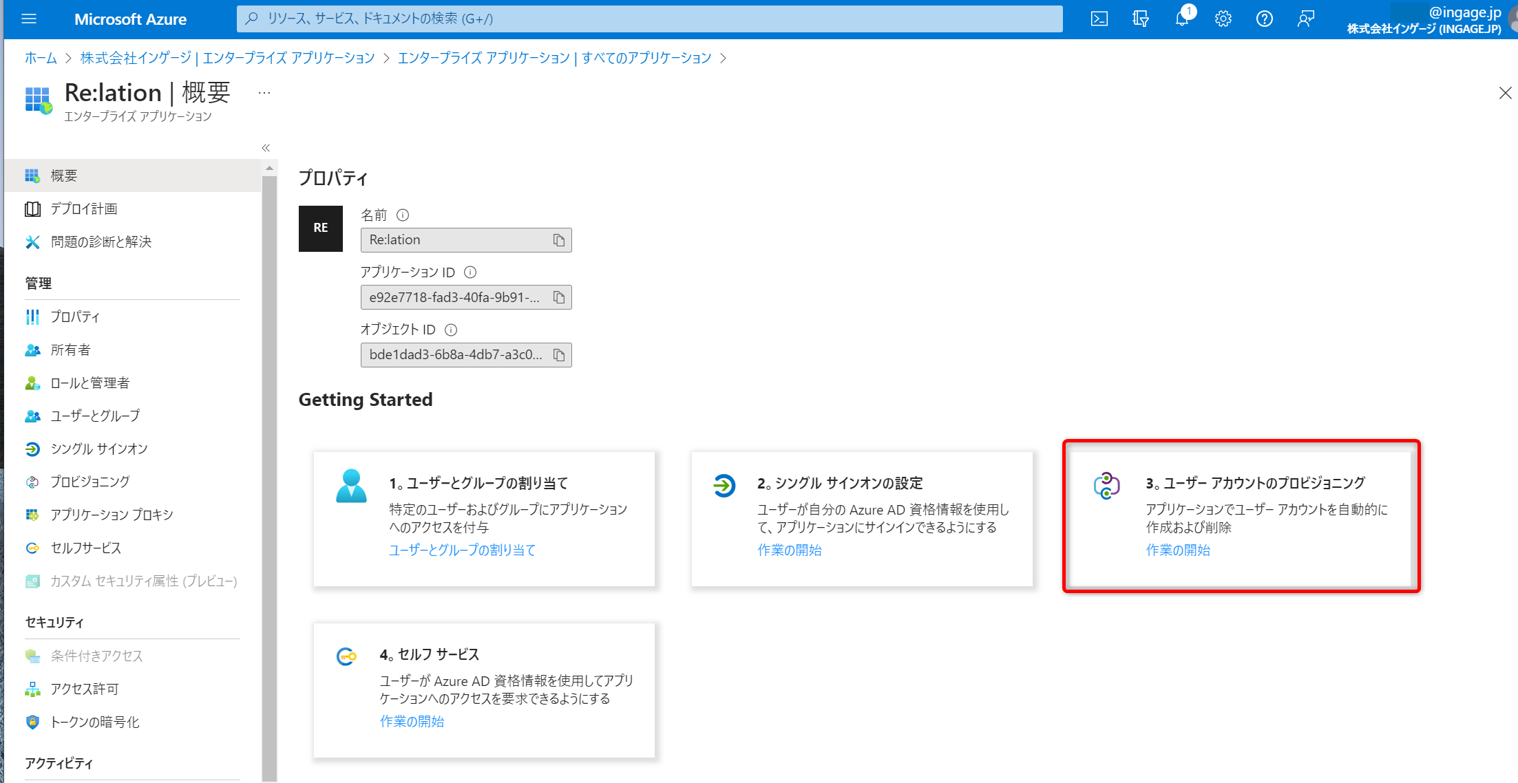 1.Azure AD>エンタープライズアプリケーション>「Re:lation」>「3.ユーザー アカウントのプロビジョニング」の[作業の開始]をクリックします。