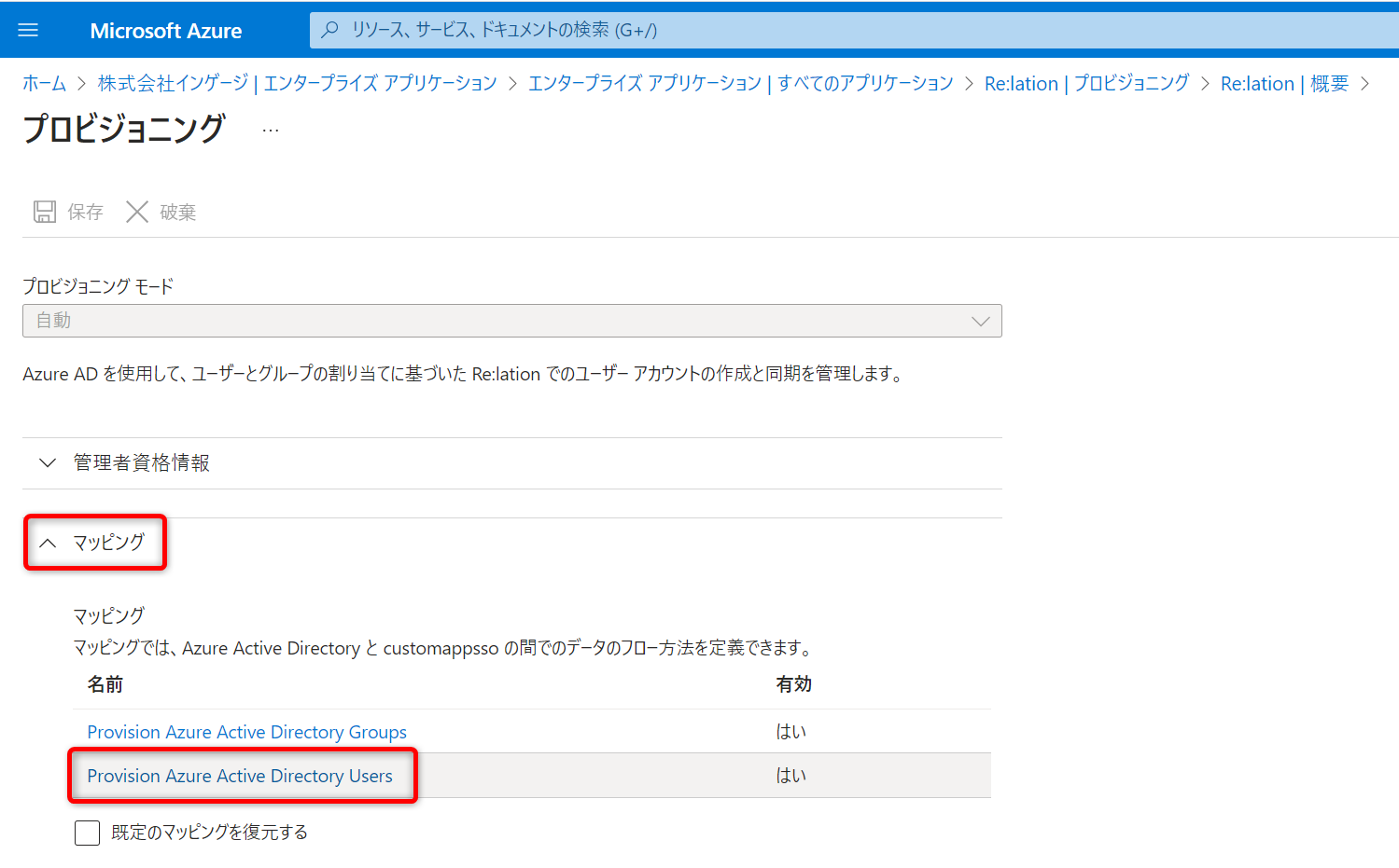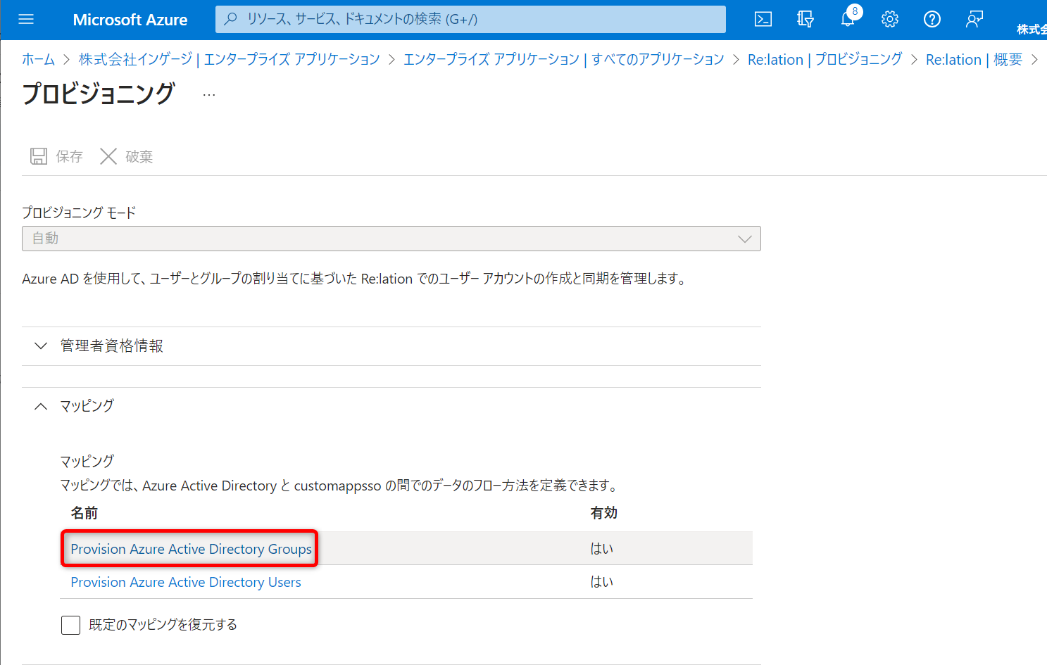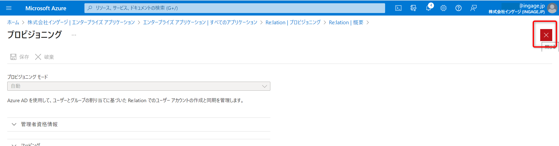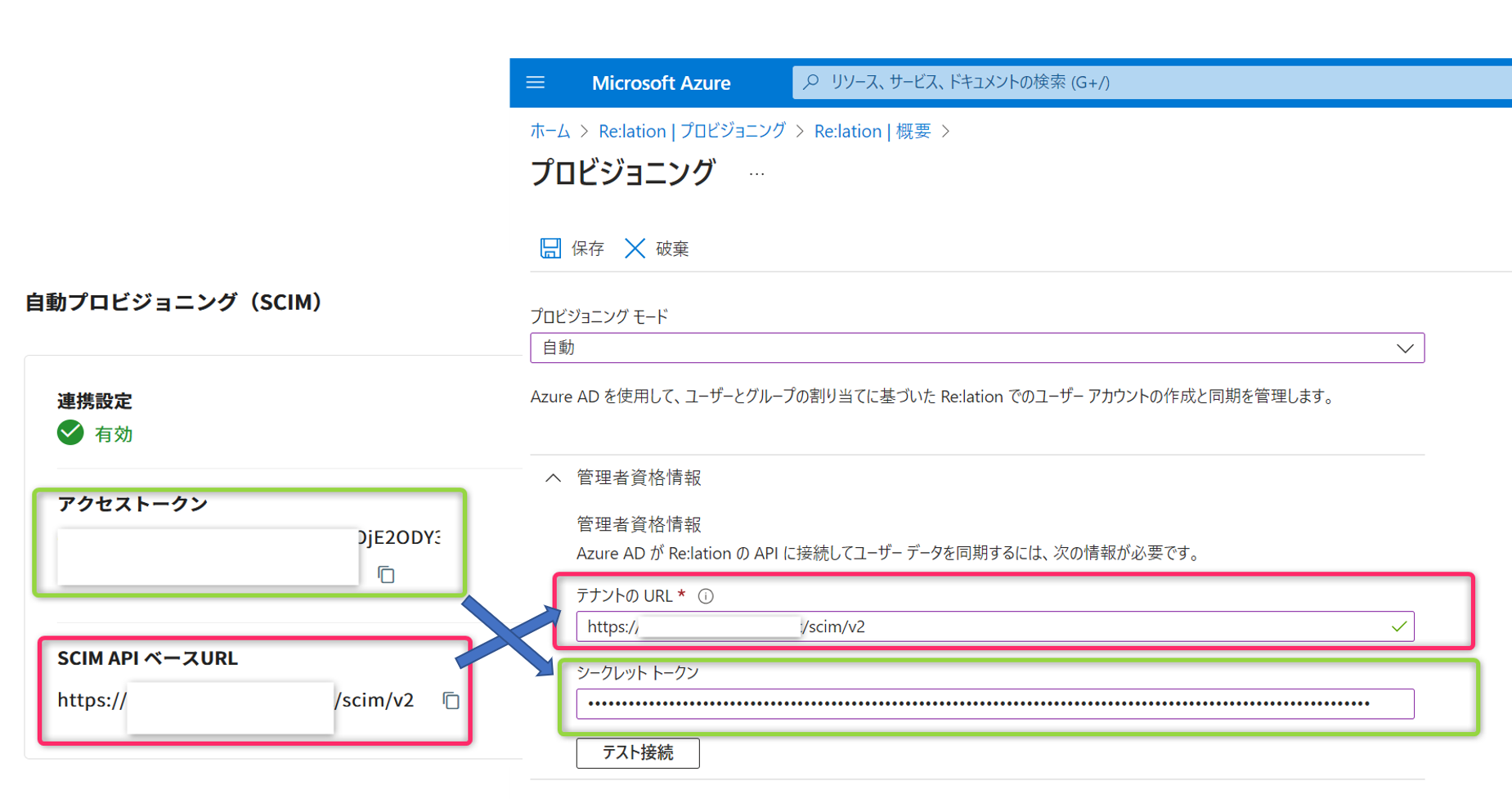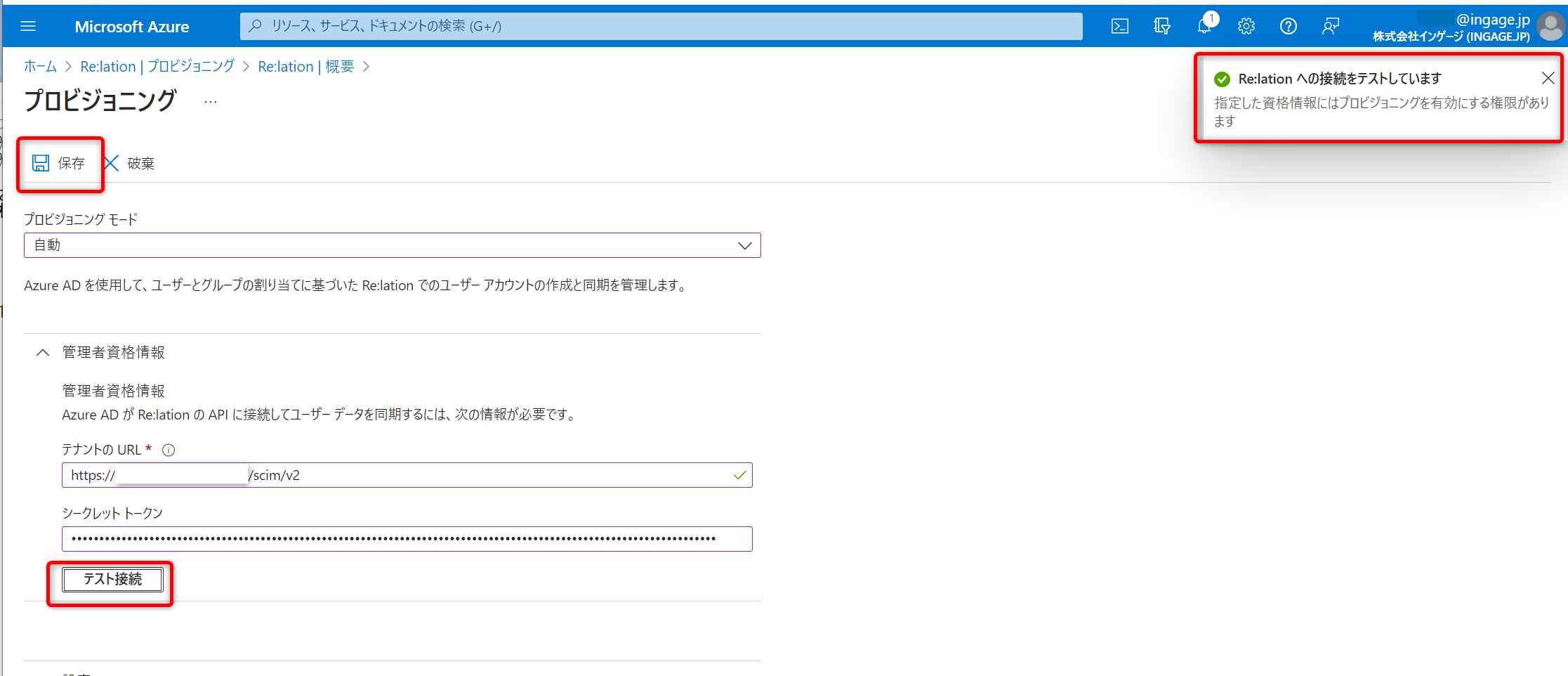 ここで表示されている「アクセストークン」と「SCIM APIベースURL」をAzure ADに入力するため、どこかに控えておきます。Azure ADでプロビジョニング(SCIM)を設定するAzure ADに作成済みのRe:lationのアプリに、プロビショニングを設定します。
