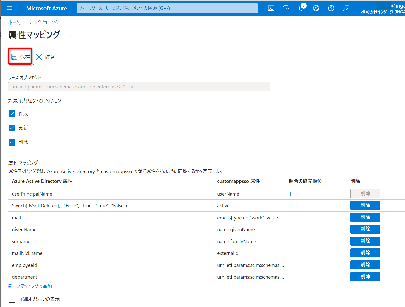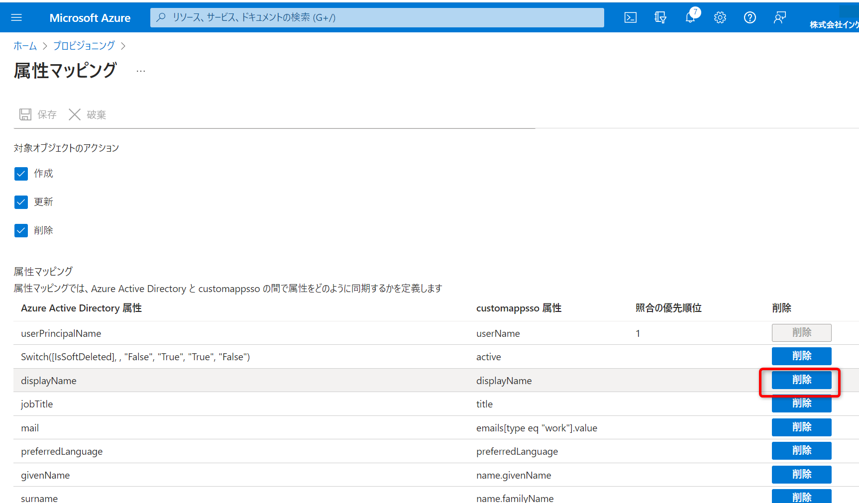 7.表示されている項目のうち、以下項目のみを残し、それ以外は[削除]します。Azure Active Directory 属性 userPrincipalName