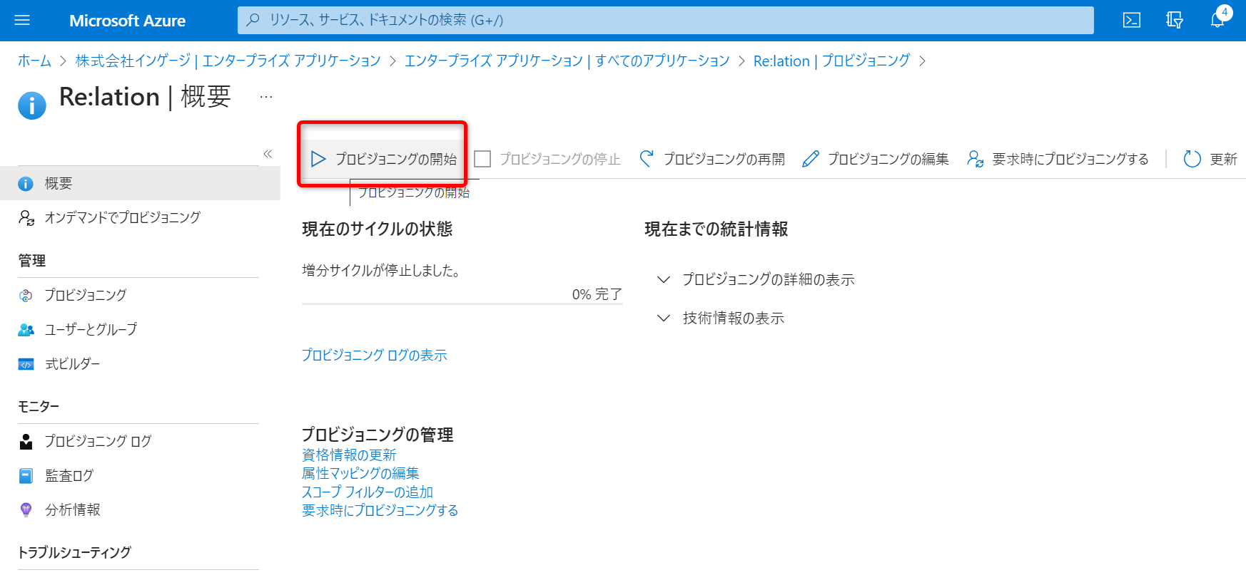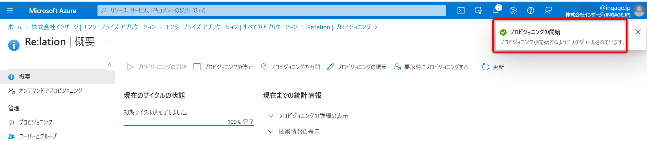 15.[プロビジョニングの開始]をクリックします。これで設定は完了です。Azure AD上のユーザ情報とRe:lationの情報が同期がされます。